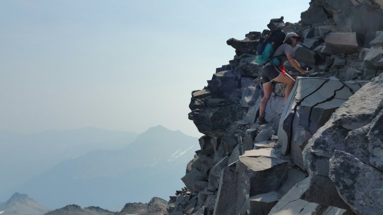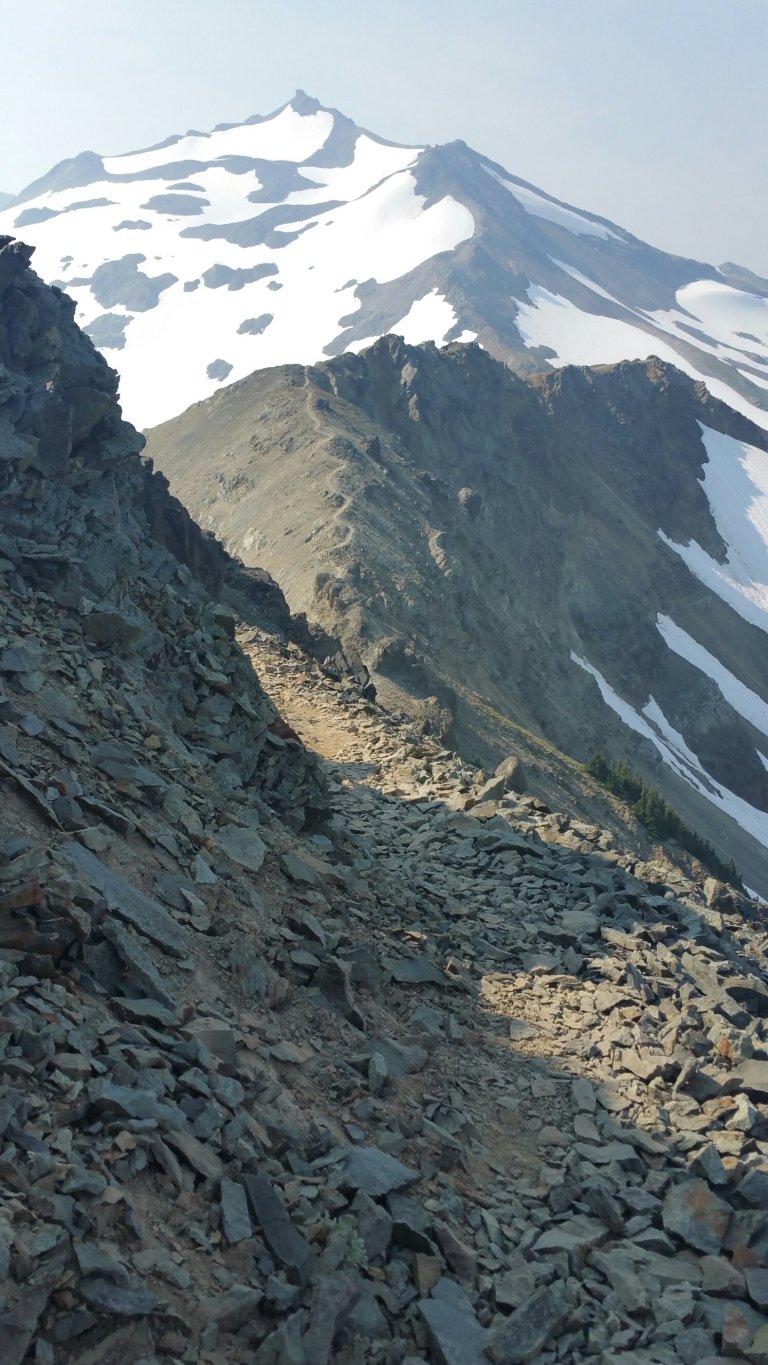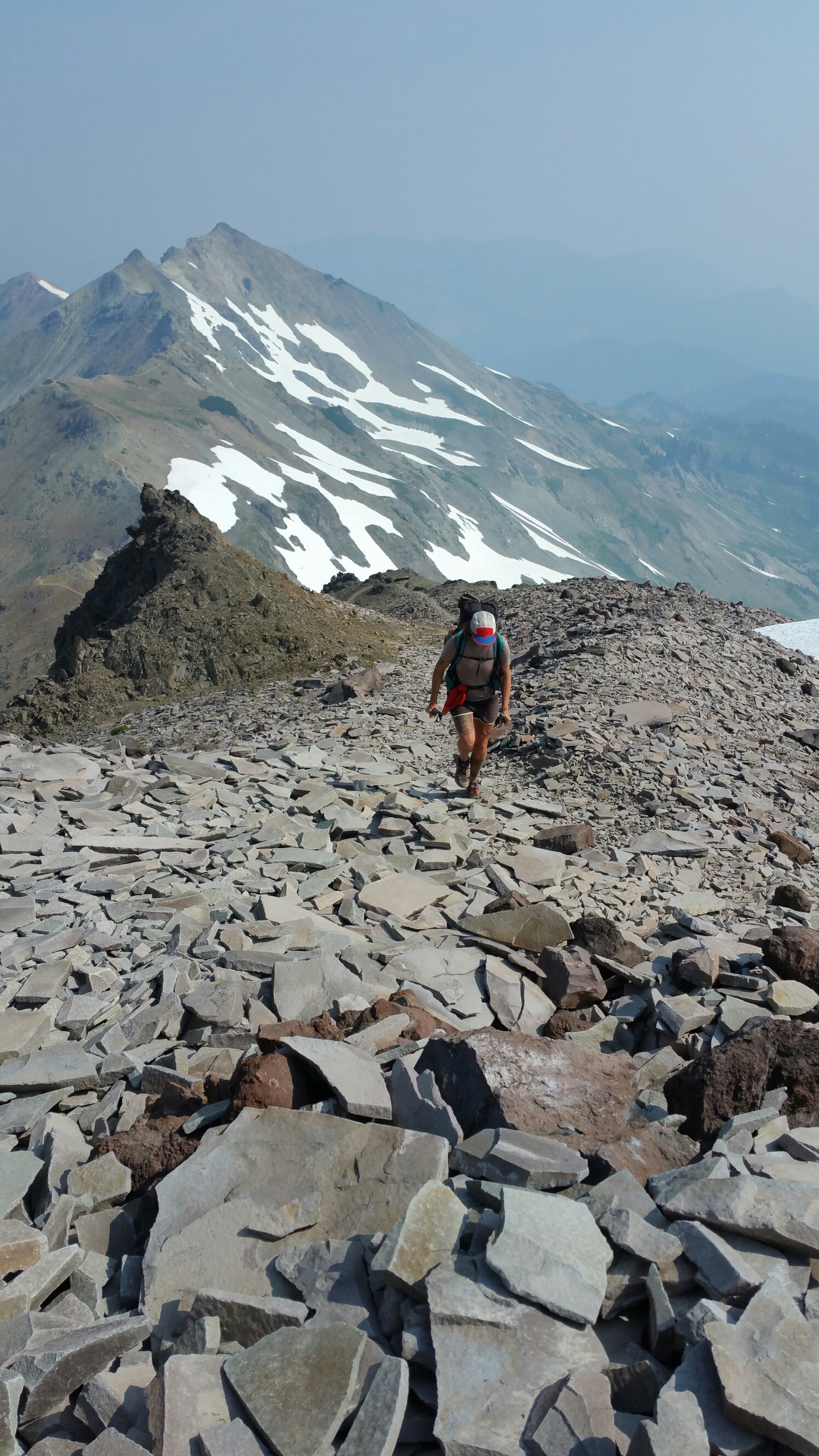 Starting the climb up knife’s edge filled me with adrenaline, it was such a different experience looking all that way UP and knowing I had to climb it. So different than last year coming down. Last year I had amazing views of Mt. Rainier, but today, it was just that looming ghost of a melting ice cream cone, nothing to write home about. But that mattered not, I was really into the close up detail of the Knife’s Edge and all the slabby rocks that clanked as I stepped on them. The terrain did quite a job on my ankle, but it was worth it 100%.