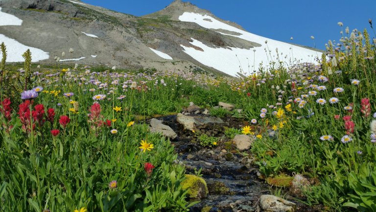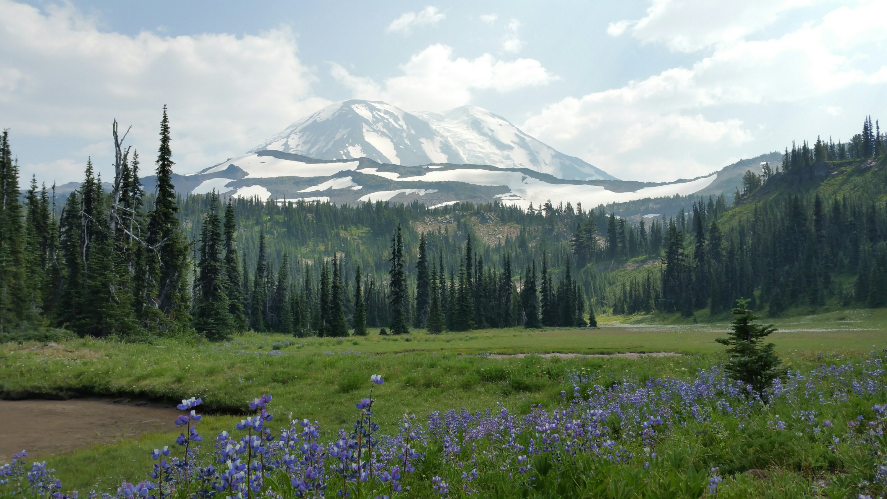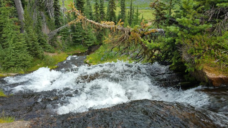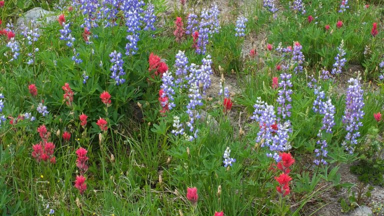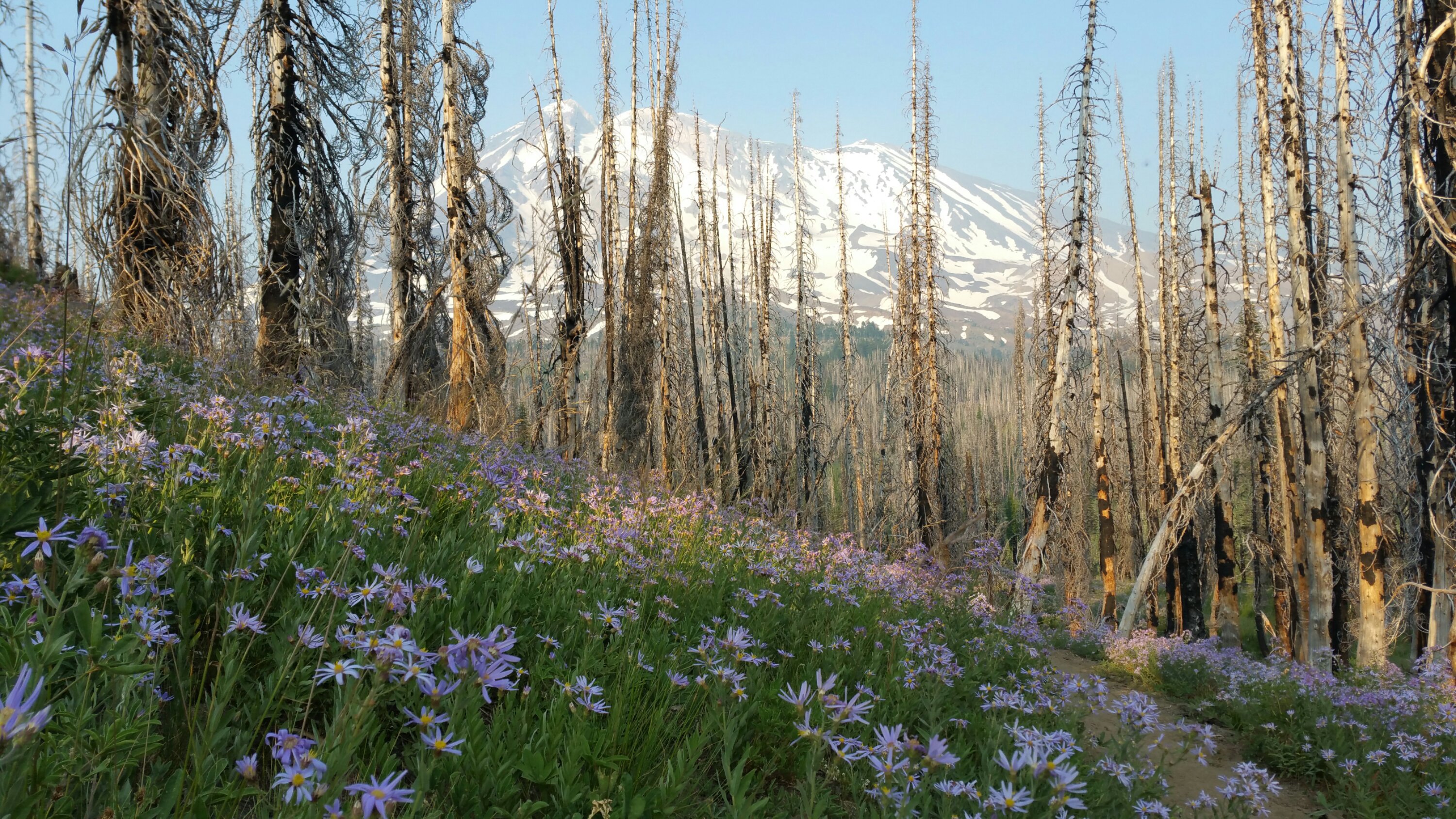 By the time I made it to Killen Creek, my menstrual cramps were bad and I had to stop and take some Ibuprofen. I hate taking it because it makes me very sleepy. So, I went from super high on caffeine to super low on NSAID’s. So be it, I was rewarded with amazing views of Mt. Adams, so much better than I’d expected due to all the smoke. The Wild Lupines and Indian Paintbrush were also on point, just spreading across fields and slopes, lining all the little cascading creeks, and showing off in their glory. I was bedazzled.