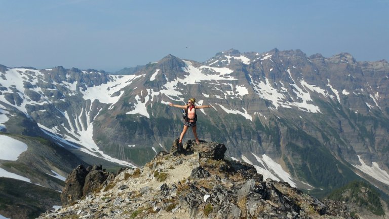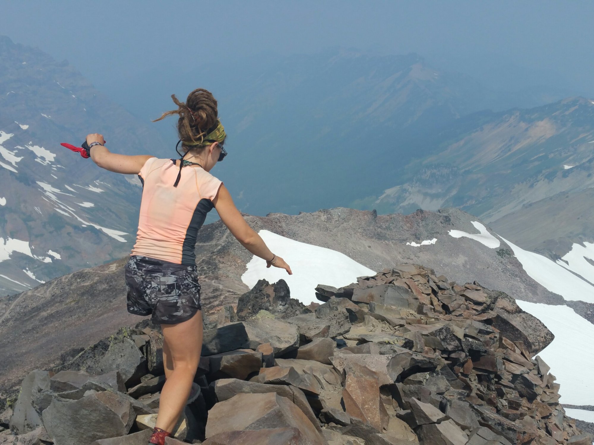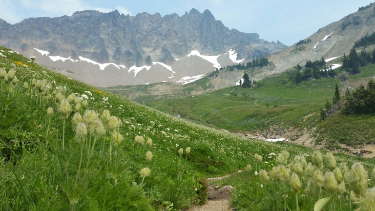 Taking that side trail was refreshing for me, using different muscles, using my hands, getting the stellar views, adrenaline surging, it was thrilling. We headed back down after lunch exuding exuberance and Carrot took a really funny photo of me skipping through the wildflowers. Back on the PCT, we traversed a snow field! We passed by a small turquoise tarn, and started seeing several day and weekend hikers, wondering where they all came from?