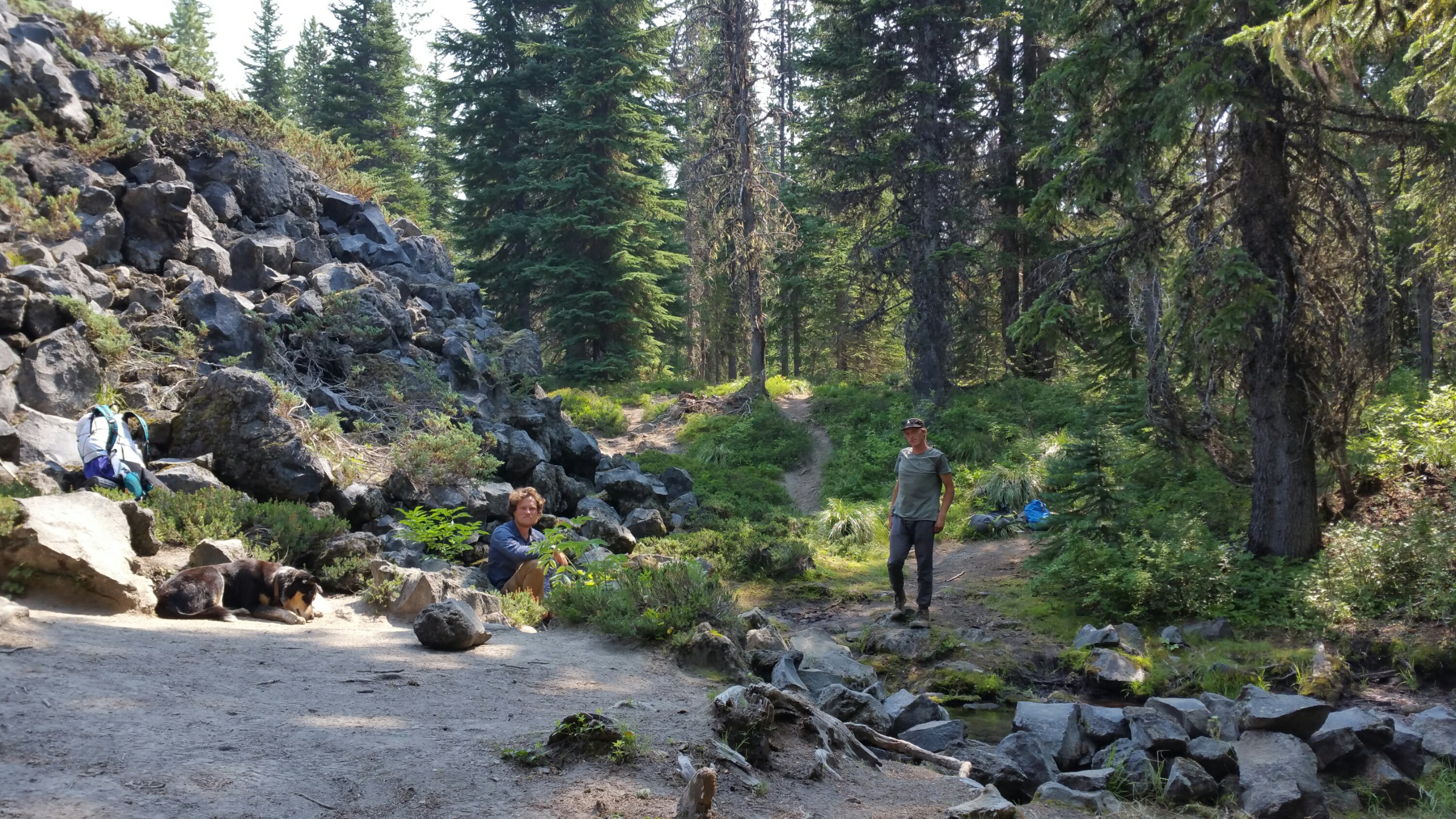 I ate Maca cookies and Yum butter for breakfast and so I zoomed along the trail for the first 11 miles to Lava Spring. This is one of THE BEST places for water on the entire PCT, hands down. There is a section of lava that the trail hugs the edge of, and you start seeing the black rock off to the East. On the maps you can see how the trail specifically and explicity follows the exact line where the lava ends and dirt begins. It is quite interesting and while I appreciate seeing the lava, I also appreciate that I still get to walk on dirt trail. The spring is the coldest, freshest water that emerges from deep in the Earth beneath the Lava fields, and collects in a couple of pools which the trail passes right over. As it goes, there ended up being a cluster of thru-hikers gathered periodically at the spring, Nobos and Sobos alike. We stayed there for close to an hour, eating lunch and of course I made glorious iced coffee, which I paired with coffee crunch dark chocolate. Zooooom….