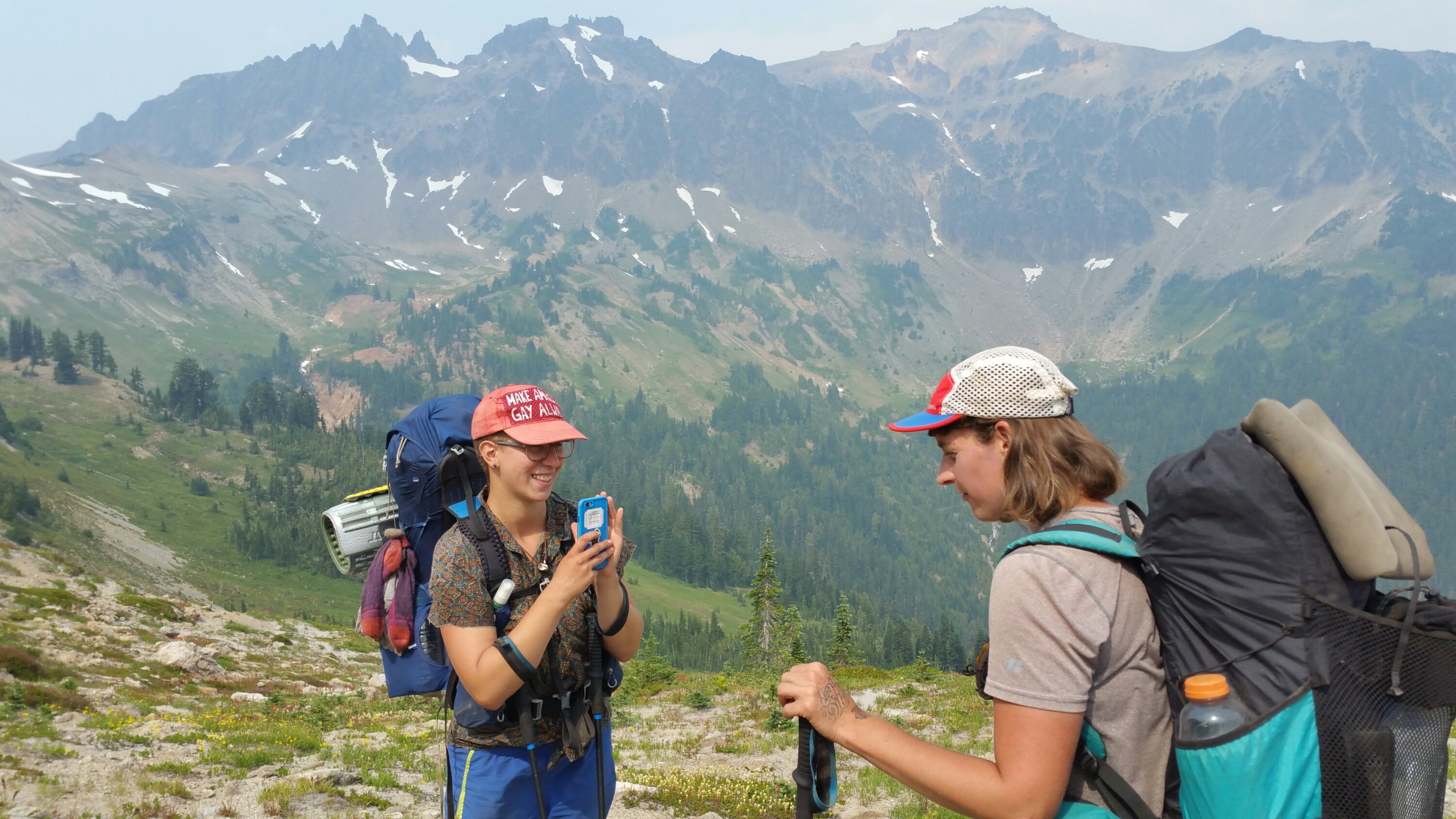 Cispus Pass was no less stunning than it had been last year, and as we crossed the notch at the top we stopped for a snack. It was actually pretty hot out and I tucked myself up in the shade of a big tree. Shortly after the pass, we ran into two women from Maine, who were doing 45 second interviews of hikers, where you have to tell your “whole life story” in 45 seconds while they video you. It was fun and the young woman conducting the project wore a hat that said “Make America Gay Always”. Love that!