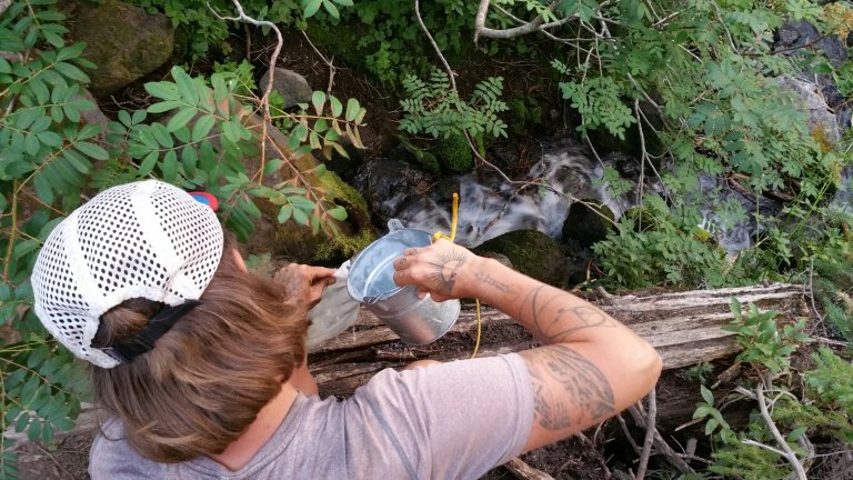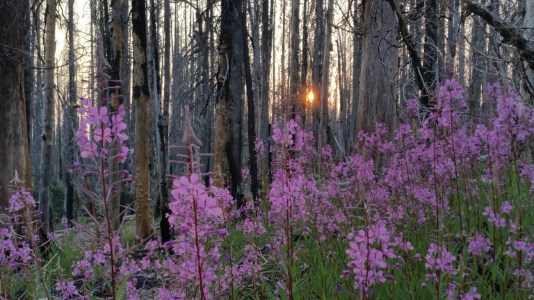 By early evening, when the light turns to gold, we found ourselves in a massively beautiful burn area. I specifically remembered this from last year, and I started to slow down and take photos. Carrot was just as enamoured with it as I was and we took our time through those miles, appreciating the stark beauty of the sleek black trees, the fireweed glowing pink and the special evening light. As it turns out, we ended up camping in the burn area, just 3 miles before the Hwy that goes into Trout Lake. We stopped and collected water from a spring that had a quaint little bucket attached to a rope on a tree. It was sweet and I had fun collecting.