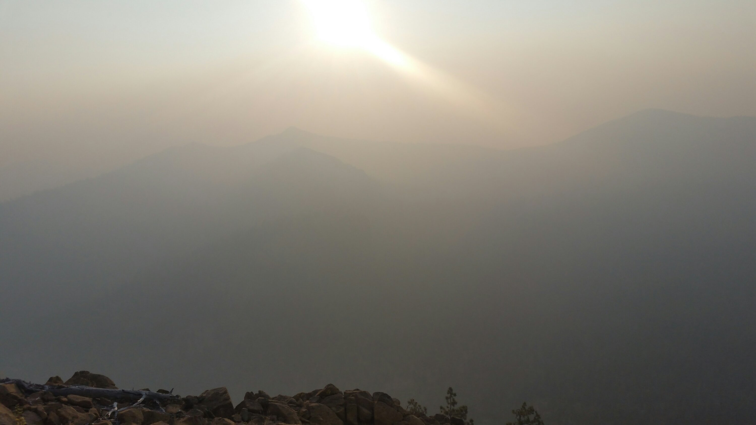 Overheated, rationing water, breathing in smoke, dealing with pain and more pain, wondering why there is so much smoke here and why it seems to be getting worse….and then as if just on que, if I were Katness in The Hunger Games, just when I feel I can barely tolerate the next 4 miles down to camp, they throw those gnats in my face. I detest those gnats. There were so many of them, buzzing in my ears, flying right into my eyes, up my nose, and they would not go away. That is the test of tests. I would rather take mosquitoes any old day over those gnats, just sayin’. I fanned my face with my paper maps, but needed both hands to use my trekking poles to make it down the rocky slopes, the dilemma. This is thru-hiking.