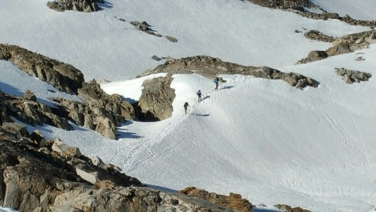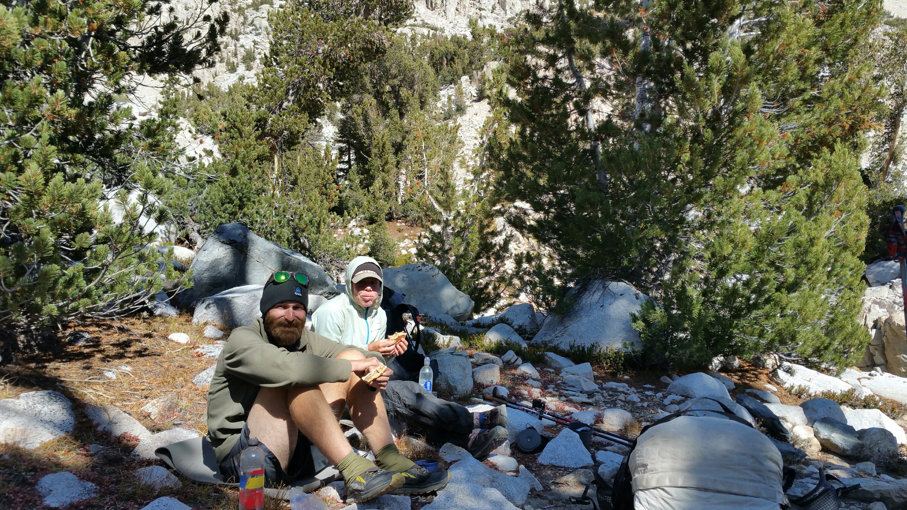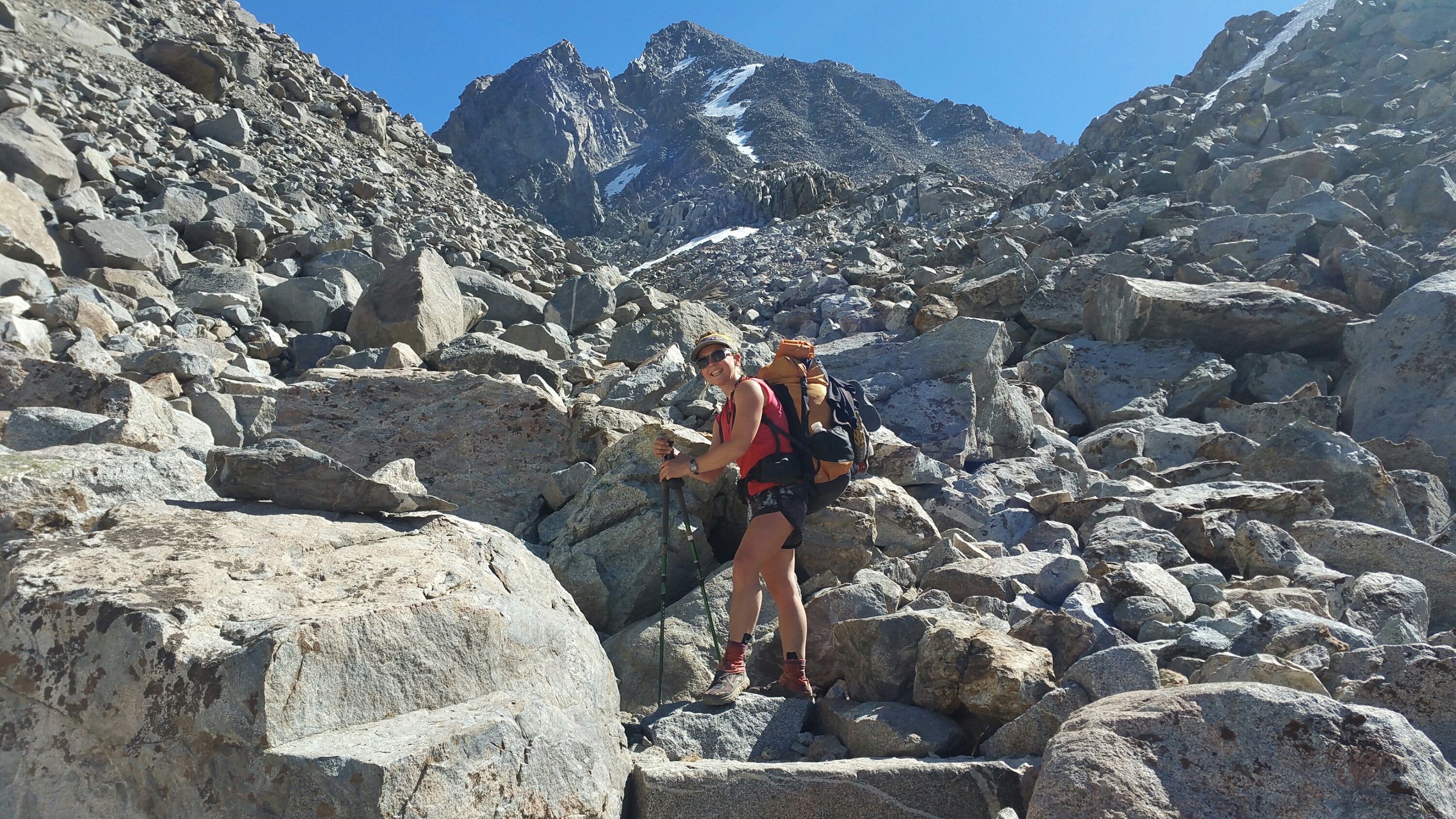 As I followed the loose rocky trail downhill, the valley below revealed a deep crevice, that which we would be walking into. I walked with Tall Joe for a while and enjoyed a little conversation, then he jumped up ahead and then I was ahead of only Mr. Clean and everyone else was up ahead. We’d planned to stop around 2:00pm for lunch, so I just took my time and enjoyed the solitude. I remembered where we had camped last year and how we woke up in the wee hours of the morning to get an early summit to the Pass. Everything was covered in feet of snow, and looking around it all now, I was baffled as to how on earth all these giant boulders and giant spaces of air were hidden? What was I walking over then?