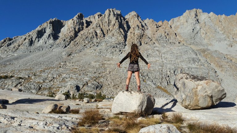 I started out on the trail in warming conditions, it was 25 degrees when I started walking, and soon I was crossing the inlet of Evolution Lake, hopping over the large rocks someone precariously layed down who knows how long ago. I made a video crossing that creek, and crossed back and forth a couple times, pausing in the middle of the creek so I could feel suspended in time, with the water rushing on all sides of me. I spent time looking back down the Valley, saying “goodbye for now” as each time I have left this place, I always felt a pang, an ache, in my heart, not wanting to say goodbye, tearing myself away, hedging slowly forward. This time, I took it all in, knowing I was leaving again, but it felt easier I think because I am getting to know this place, and I know I will be back.