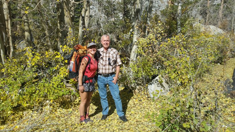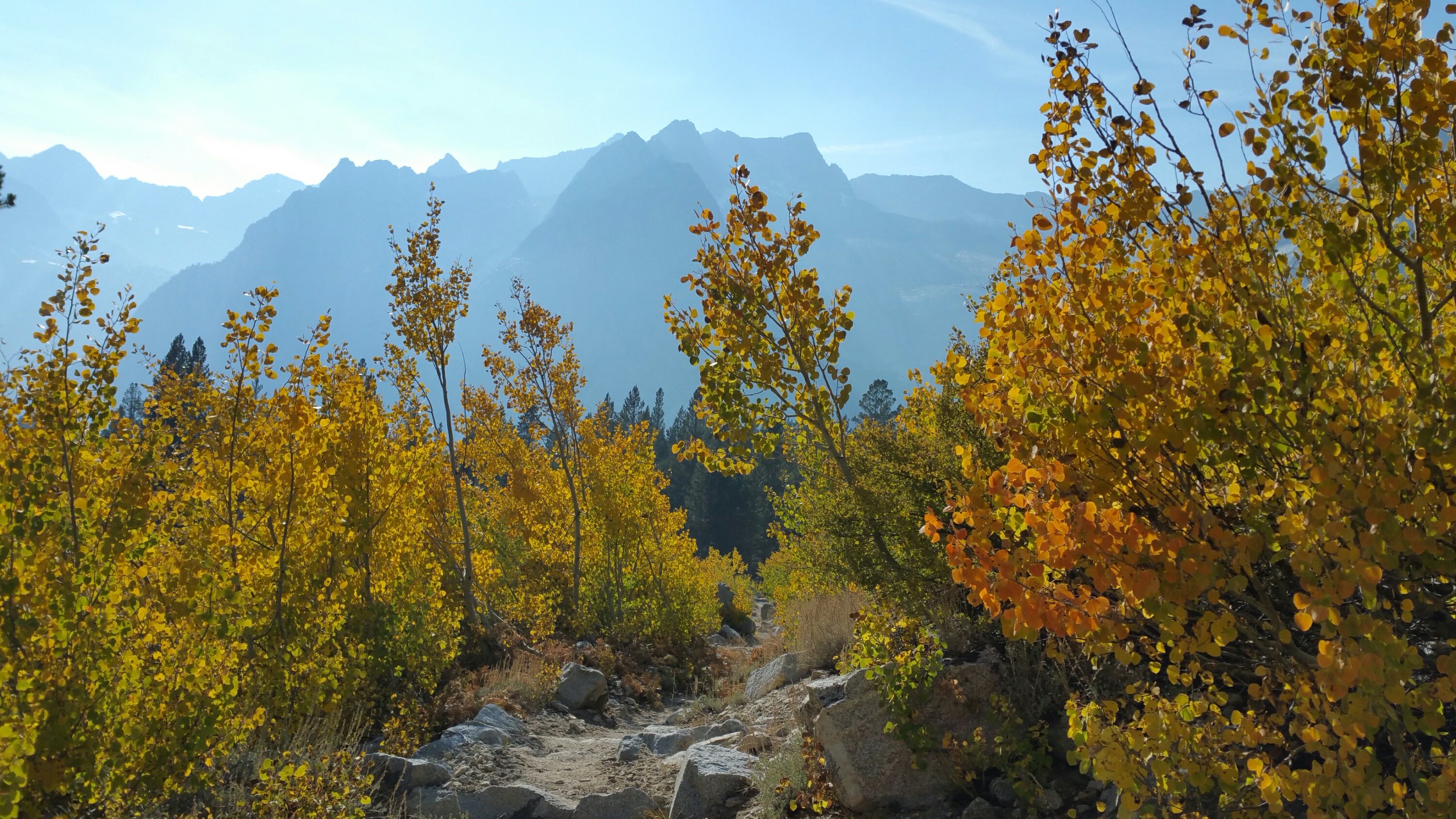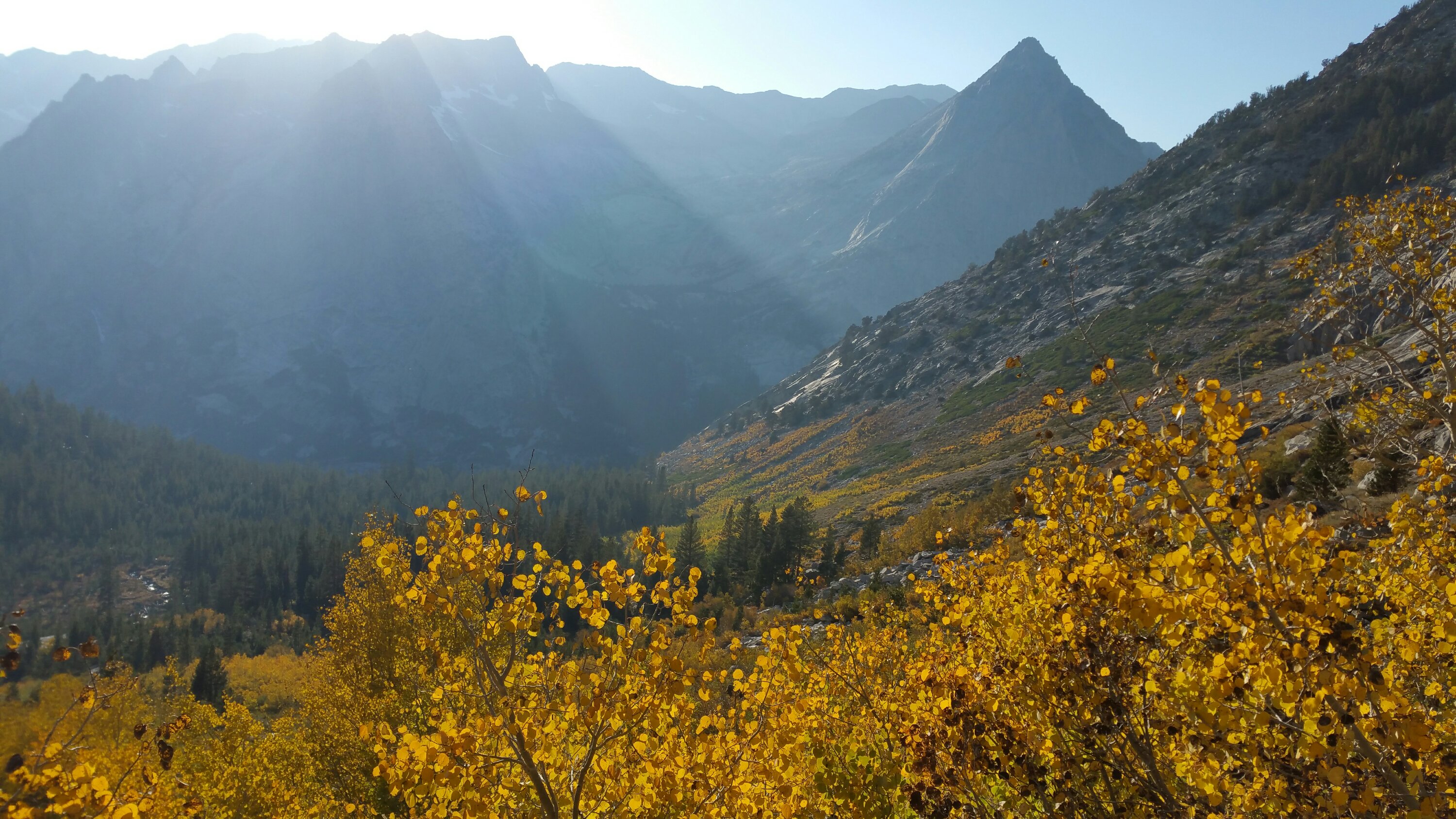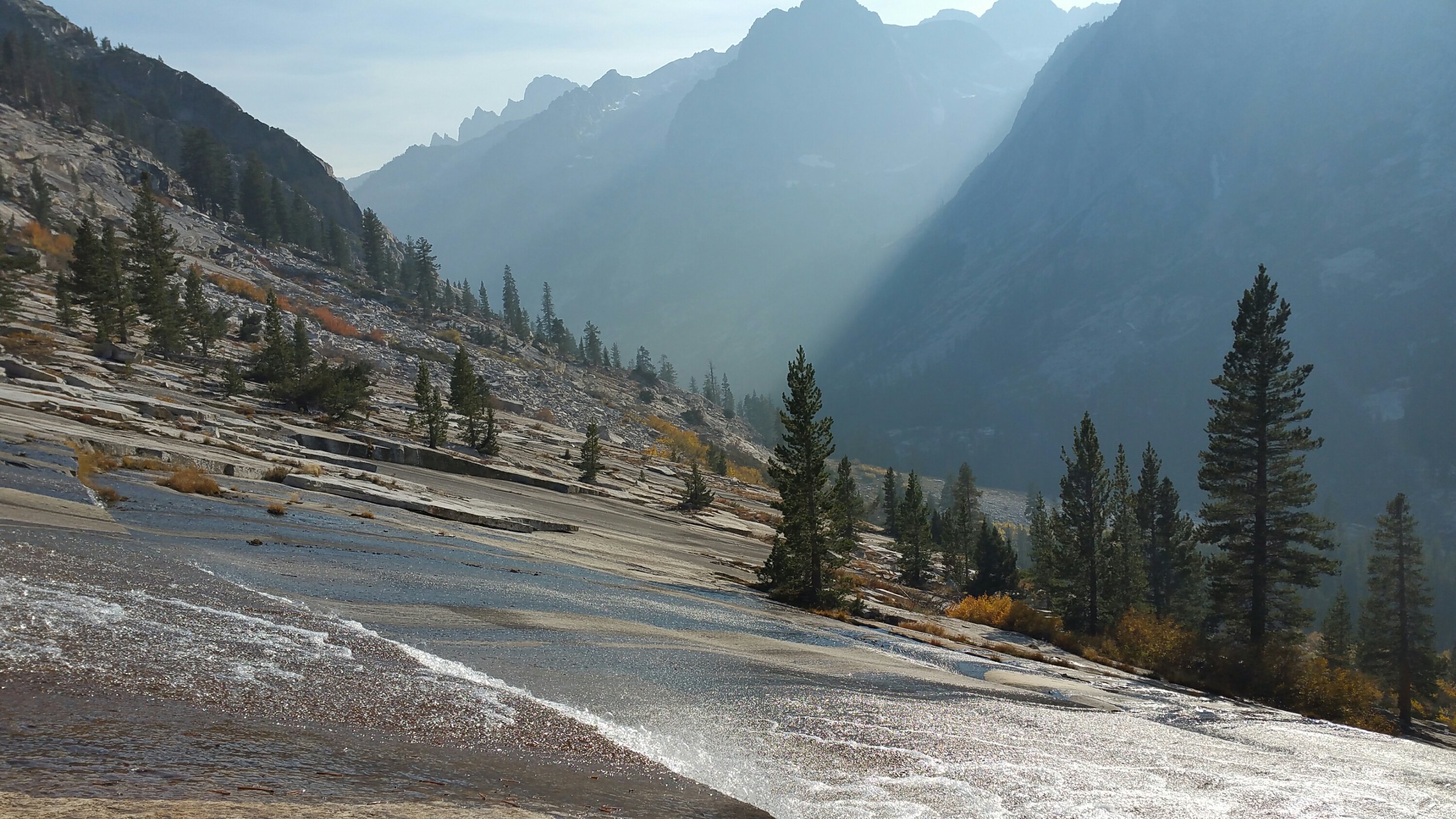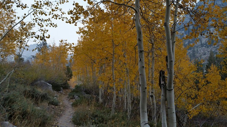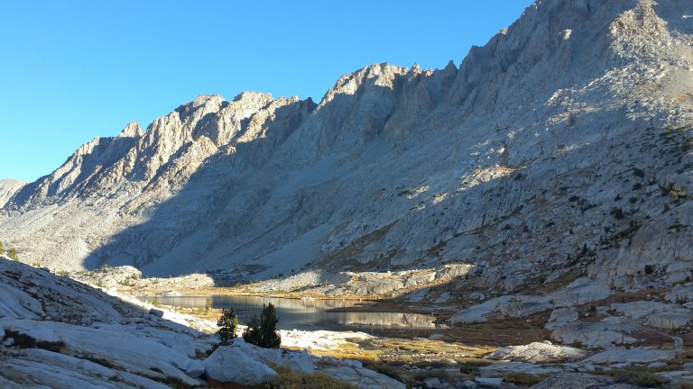 At one point LT & Laces even asked me if there was something I knew that they didn’t know since I was walking so fast. Yes, I did, it was the climb up to Dusy Basin. From the PCT/JMT it is 11 miles up through Dusy Basin, over Bishop Pass at over 11,000 ft and down to the South Lake Trailhead. We planned on climbing the 2,500 feet from the PCT/JMT up the Bishop Pass Trail and camping somewhere just a couple miles shy of the pass. So, we had our work cut out for us. That climb is a beast. There is no break in the uphill, just a solid steady gain. But holy shit was it beautiful. I enjoyed that climb that evening as much as I have ever enjoyed anything. The sunlight was slowly disappearing behind the giant rock walls that line the drainage of the Kings River. This place is magical, looking in any direction, you feel so small, you feel the power of the rocks, and the casting glow of the sun was highlighting the yellows of the cottonwood and aspen trees, the timing could not have been more perfect. I could not stop taking photos and I kept looking up and looking around to take it all in, trying still to keep a decent pace climbing.