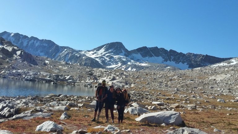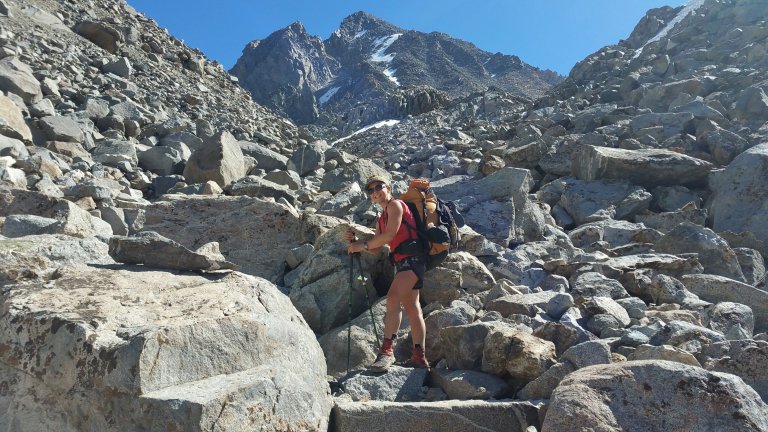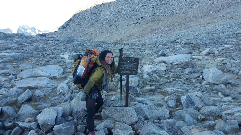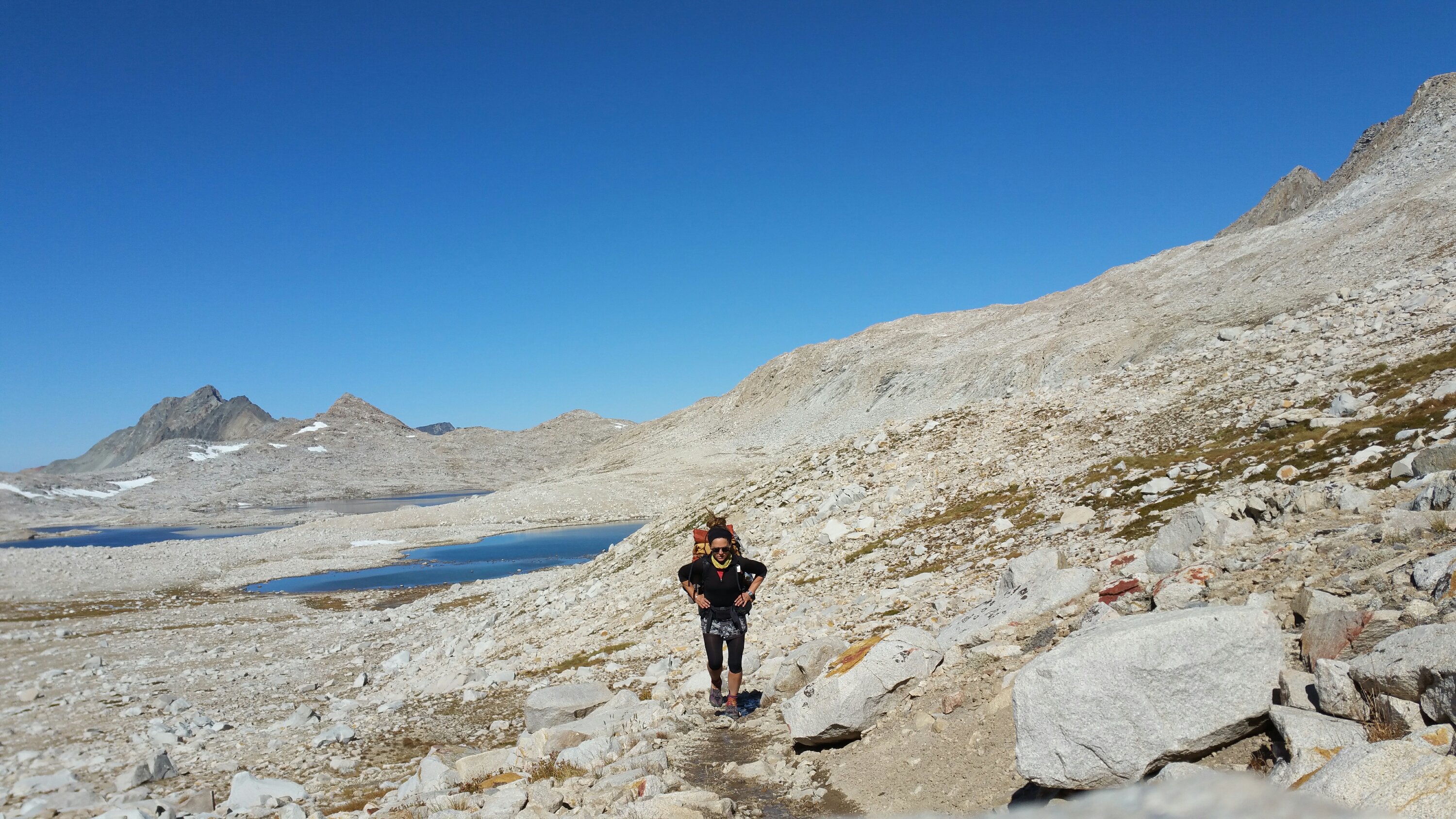 I was fortunate to have my Dad’s support once again, and he was planning to meet me at the trailhead and drive me, and as many hikers as we could fit into my Jeep, down to Bishop. We agreed to meet at 10am, so the rest of our group headed out by around 7:20am, trudging up the last bit of the climb to Bishop Pass, sitting at 11,194 ft. It’s stark up there, yet the scenery is second to none. I absolutely love it, it feels so looming and large, the way the granite walls tower over the pass in steep angles, creating crevices and shoots that if one slipped, could be fatal. The trail travels on a steep downhill over several tight switchbacks, and all the while one is staring at these granite monoliths right there next to you. So close, you could touch them, yet they are untouchable.