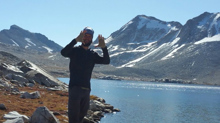 As I walked further up the trail, my heart was so wide open and receiving the beauty in heaping portions, and I just tried to keep letting it all in. Mr. Clean was soon walking with me, and we caught up with Tall Joe, who had stopped at Wanda Lake for a snack break and water. He was smiling from ear to ear, too. We marveled at the clarity of the water, and started that inevitable conversation about what we were going to eat when we got to town. Tall Joe really wanted Cheesecake. We were anticipating several visits to the famous Erik Schat’s Bakery, and I’d been hyping it up quite a bit, with complete confidence, because it is just that good. So, yes, Tall Joe would get his Cheesecake, and I, my Chocolate Croissants. Meanwhile, bringing our attentions back to the present moment, we snapped photos of eachother with the lake and mountains in the backdrop and set our sites on the Muir Hut where we would all have a break and make hot tea. What a great plan!