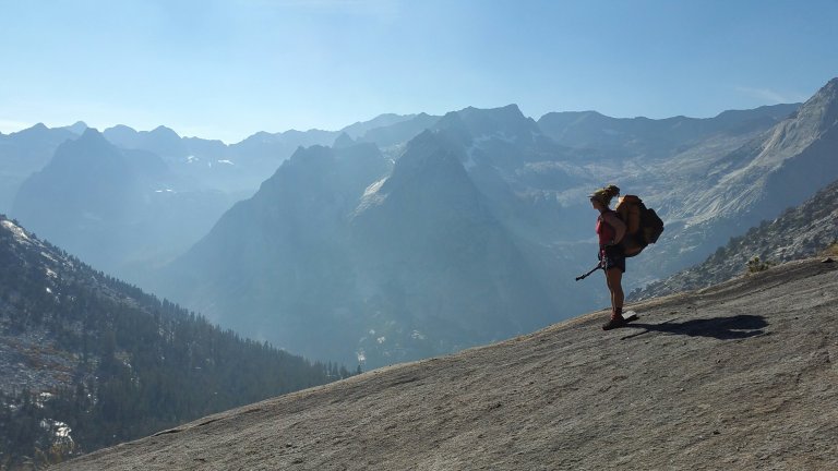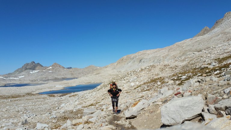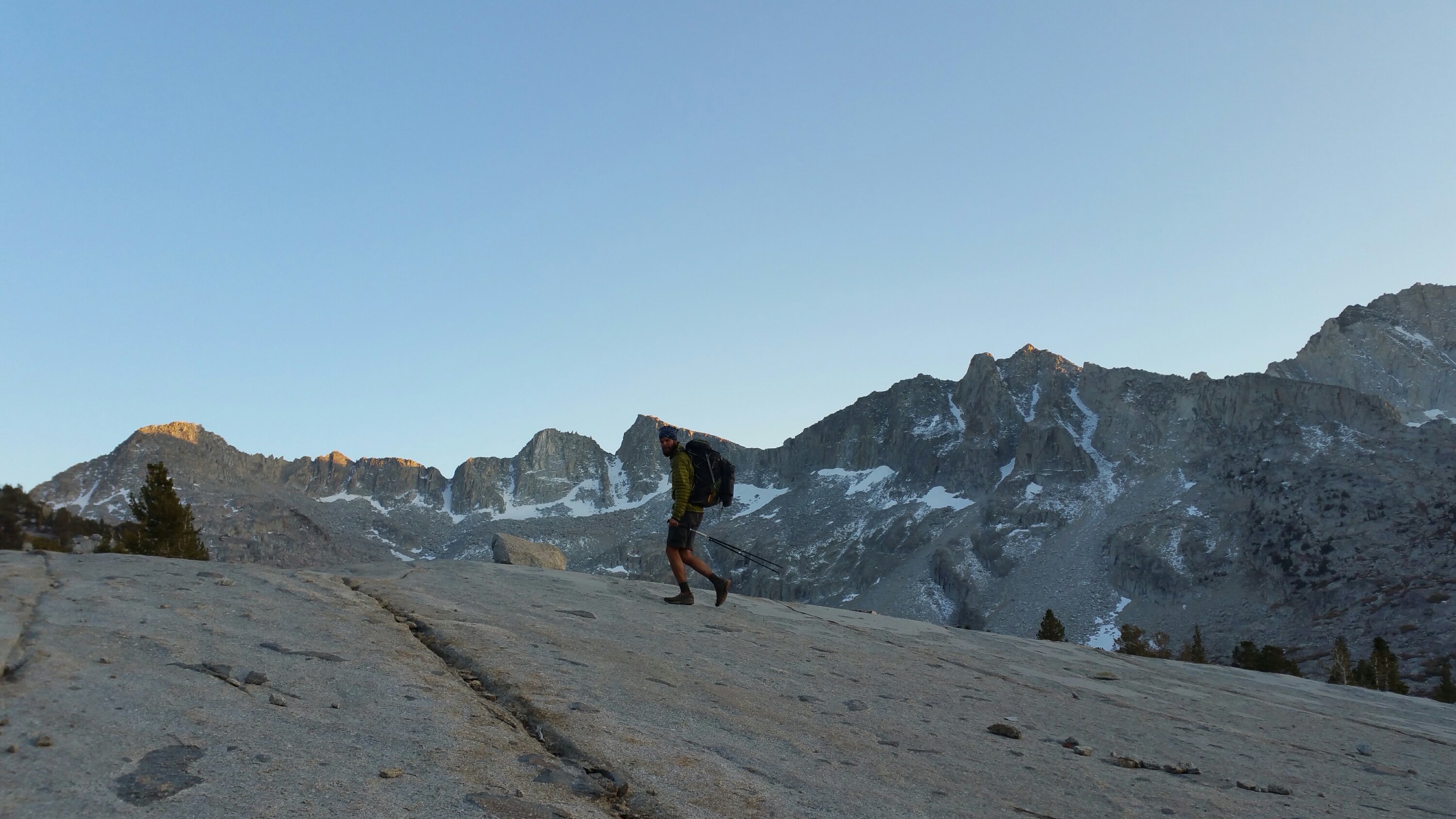 Tall Joe walking across granite towards our nearly 11,000 ft camp…