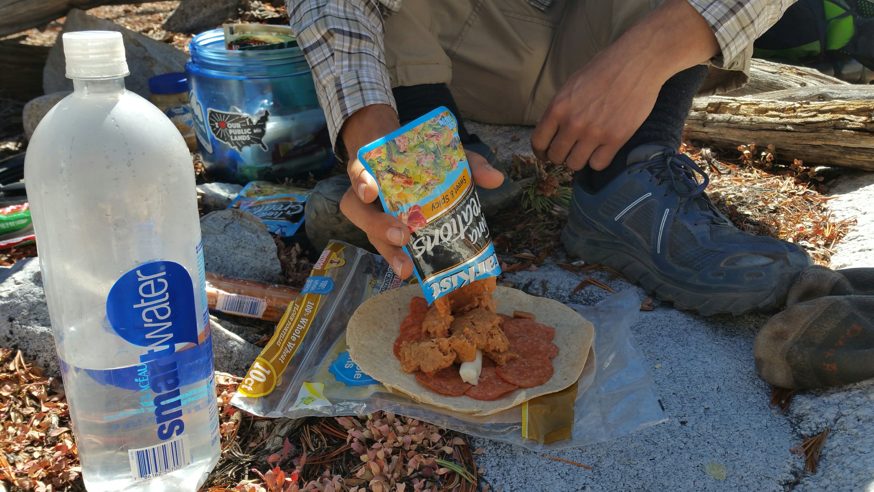 A few miles later I made it to “lunch” and found my little trail family sitting off to the side of the trail witih gear splayed out, food concoctions being made and consumed and Laces all bundled up with her jacket on whereas Tall Joe was laying shirtless in the sun. I picked a sunny spot and put my jacket on too, as the air temps were chilly. I made my lunch of tortillas with mustard, peppper jack cheese and smoked salmon. Wow, is that the most satisfying lunch or what?