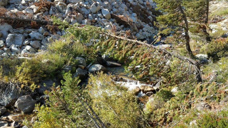Suddenly, Oh my Gosh, my low abdomen is cramping up real bad, it hurts, I think I may have some gas, or maybe I have to pee. I decided to try and wait it out, but it just keeps getting worse until finally I realize I need to poop, like now! I start frantically looking around for a place, and there is nothing but rock and steep, really steep, slopes along both sides of the trail. This is not good, I start to worry, seriously worry that I may have an accident. So I just stop, right where I was, and throw down my pack. The release of the belt buckle provides immeidate relief of the cramping and I am left with only the urgency. I dig into my pack for my bathroom stuff and scramble up the steep slope, setting loose rocks rolling down the slope, and eventually I find a tree with some soil underneath, enough to dig a hole. You can do this, I tell myself, that familiar voice of encouragement like talking myself down from a ledge, I have had to do this before, and I can do this now, I think, you got this. And I do, I make it without having an accident, phew!