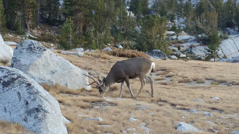 We all hoofed it up that climb and as usual, I was the last one to make it up. When I popped over the shelf where the trail finally flattened out I was so relieved to be done climbing, as I was drenched in sweat, and the sun was getting more and more out of sight, temps were dropping. After about a mile or so, I saw the entire group huddled closely together and apparently fascinated by something, or looking for a campsite, I wasn’t sure which one. Turns out it was a beautiful buck with a huge rack of antlers, and he was letting everyone get so close to him, so they were all taking photos and gawking at his magestic beauty. Pretty cool.