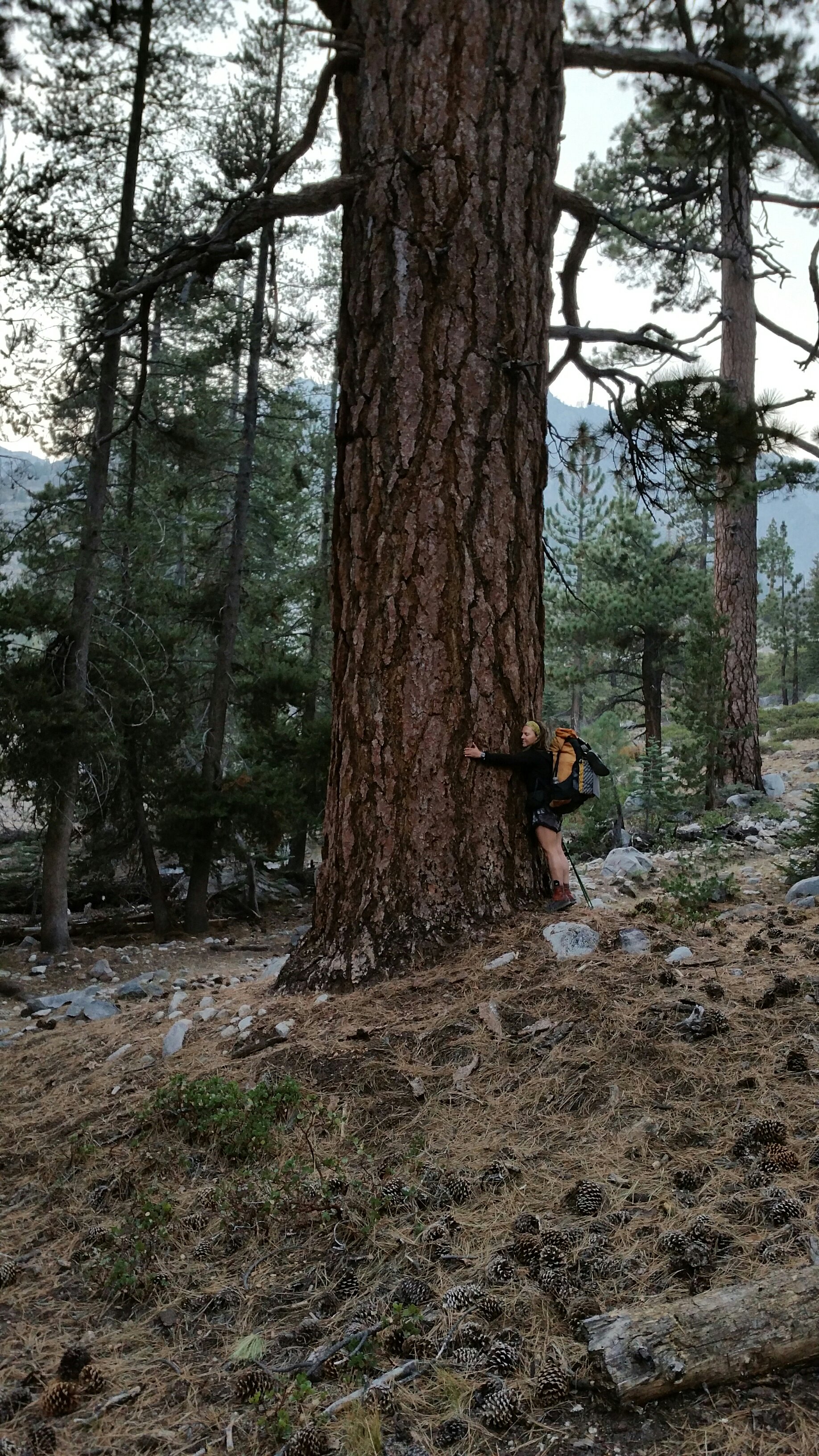 On the way back down the pass to the PCT the views were spectacular. The dramatic rock formations, sublime valleys formed by the drainages had filled a little bit with smoke, but the views were stunning nevertheless. This is a long way down, especially with a heavy pack and by 5pm I was feeling pretty tired with a few miles to go still. We stopped at a trail junction where one of my favorite trees lives, a giant Ponderosa, and I always stop there to hug it. This time was no different, and I said hello to the tree.