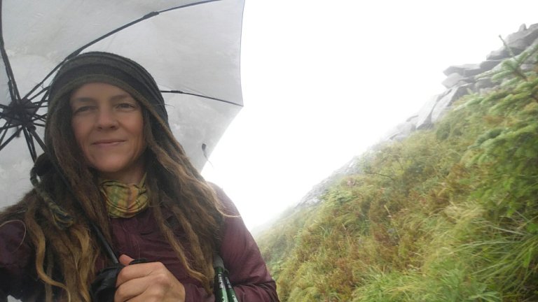 I made my way over an exposd ridge after my lunch stop and the weather began to deteriorate more, the winds picked up, the mist was thicker than ever and it was now raining more steadily. I hand held my umbrella after that for the next few hours. I stopped at one point on a tree-covered ridge, for a quick pee and a snack, as I’d become famished, and remembered I had camped there last year! It was a rainy, cold night then, it was also my Mom’s Birthday that day, and I remember getting there in the dark, setting up in the rain, everything was already so wet, and sitting inside my tent in the cold, rainy dark, feeling lonely, and missing my Mom. It was one of my lower morale nights, that one, but I bounced back by morning.