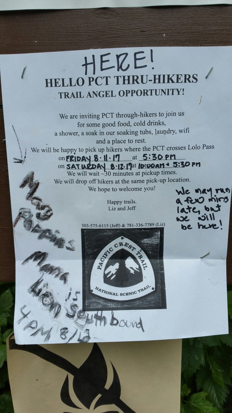 Today, no low morale whatsoever, nothingbut smiles. I pushed on from there, and as I approached Lolo Pass Road within 3 miles, I started seeing people again. I must have passed 10 people in that hour, all heading Nobo, and every one of them had a message for me from Mama Lion saying she would meet me up the trail. Lol…she must have stopped to talk with all of them! I reached the Pass parking lot by 4:30pm and saw her car there as well as a note on the bulletin board, written in a sharpie pen, over another older PCT posting, that read “Mary Poppins” and her message was…