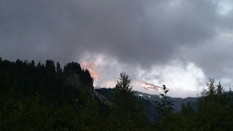 We snapped a few photos at the falls and continued on our way, not yet certain where we were destined to camp that evening. It was already getting dark in that forest by the waterfall, but when we got out into more of an open area, the sky was lighter and we could soon see the cloud enshrouded Mt. Hood in all her glory. Stunning! The sunset light was starting to glow on her face and the big storm clouds were passing by quickly, mist moving like molasses up and down her slopes.