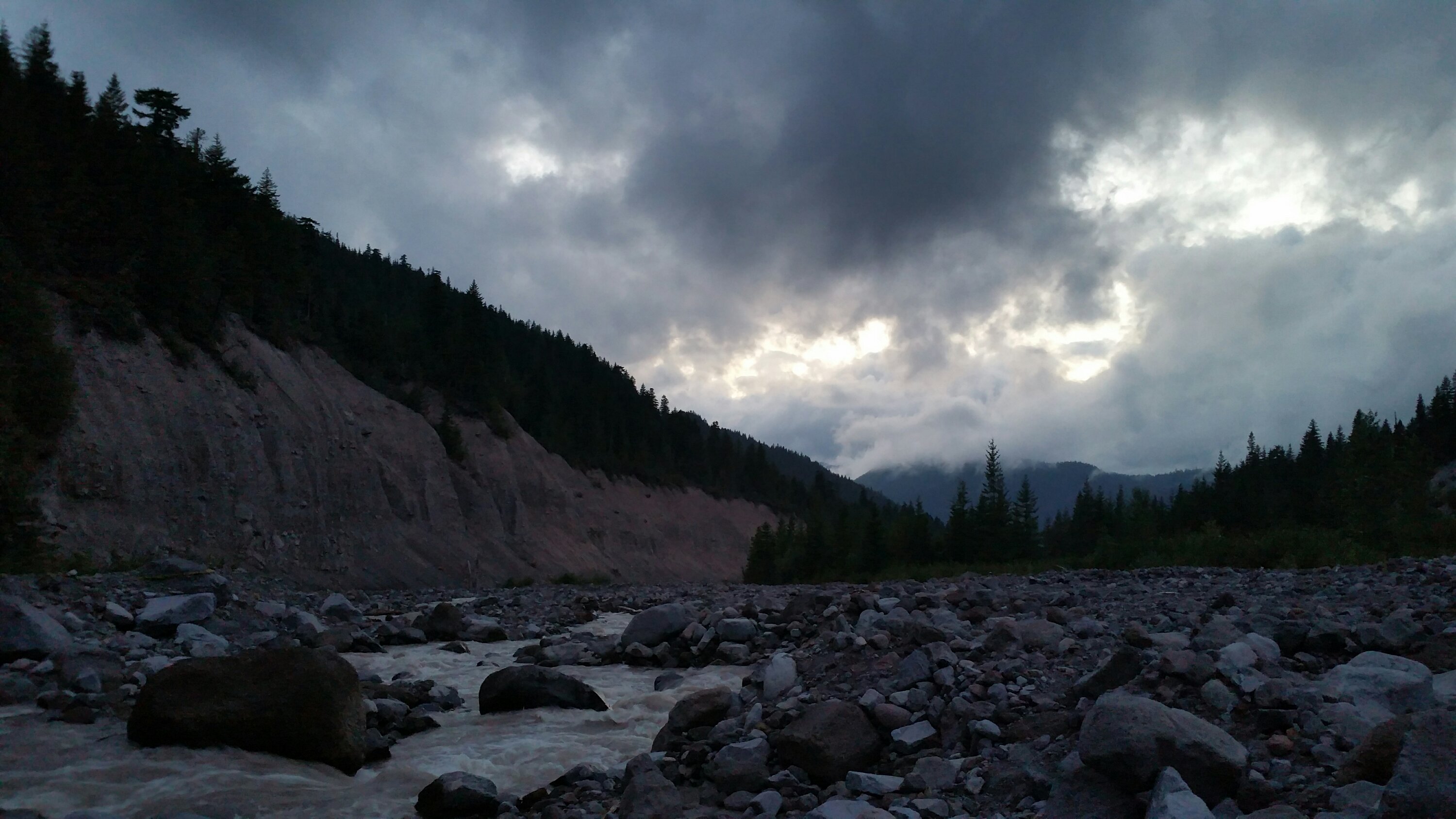 It occured to me then that we would soon be crossing the Sandy River, which is a giant wash/drainage that comes down from Mt. Hood, and I figured we may be able to get some really nice views of the Mountain from that open area. So, we started to run. Yes, running was probably not the best idea with my fairly heavy pack, but we were so excited, feeding off each other’s energy, giggling like school girls at the possibility of what we might see from the wash. Except, the trail that led down to the wash was a bit further than I’d remembered, and soon we were just out of breath and panting, saying “where does it start to go down?” By the time we actually got out to the wash, it was close to dusk, and the sunset on the Mountain’s face was already faded out. Now, it was time for the task of crossing the River in nearly dark conditions.