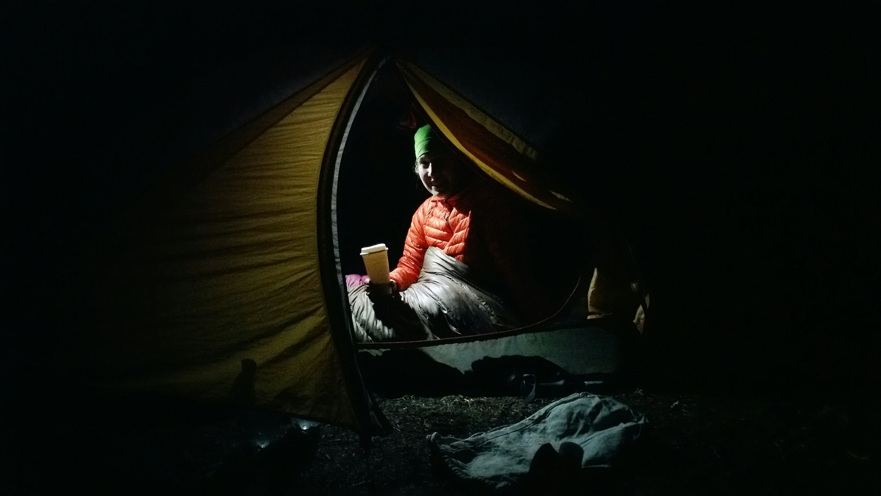Mama Lion made it across safely too, and soon we entered a thick forest where the trail wound along a beautiful rushing creek that was a tributary feeding in laterally to the Sandy River. It was much darker in the woods there and we got out our headlamps to make the last mile up the hill to our tentsite. When we finally found a place for our two tents and called it a night, I was super ready to be done for the day. Whew! What a day! By then I was pretty chilled from being wet all day, and tired, and hungry, but happy. We cranked out our camp chores of setting up tents, collecting and filtering water, and getting tucked into warm, dry clothes. Then, we started boiling water to make our dinners, and Mama Lion busted out a Platypus full of Red Wine. Hell yeah, what a treat! Now, if that wasn’t a perfect ending to such a great day, I don’t know what would be. So, there I was, sitting in the dark, rainy forest, listening to the nearby creek rush on by, chatting with my good friend, sipping on some wine and eating a hot meal. And…my feet were finally dry!