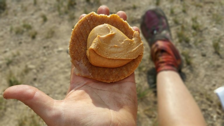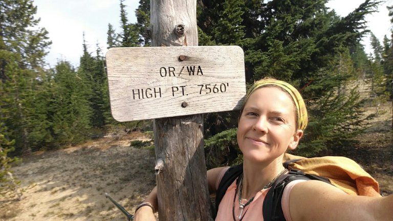 I took another food inventory: 1 dinner, 2 Pro-bars, 1 Cliff Bar, 1 Chia Bar, 1 Honey Stinger, a little trail mix and chocolate, 1 packet of PB, some potato chips, some cheese, candied ginger and coffee. Perfect for 46 miles! As I was rationing my food, I only ate a Pro Bar for my breakfast before we set off around 7:15 am. I was determined to make it 5 miles before having another snack. I played this sort-of game with myself. Why? Well, I decided it was good for my mind to become stronger, good training for me to be able to over-ride my body’s need for food. Bad idea. But, it did get me thinking about true hunger. What is that? I’ve never gone a day in my life without food. I’ve never even fasted. I won’t do it. Too many people in this world are hungry. I pushed it that 5 miles, to the OR/WA high point and as soon as I got there I stuffed my face unabashedly.