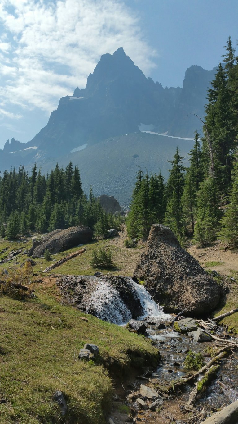 And then there’s Thielsen Peak. How gorgeous! Tripsy and I made it to the base of Thielsen Peak, by lunch time. There was an amazing fresh water source, cascading down the rocks from high above us, Thielsen Creek. We took off our shoes and dipped our feet in the chilly water. It was numbingly cold. I love fresh cold water for making lunch time iced coffee, and made each of us one. After that, Tripsy zoomed up the trail.