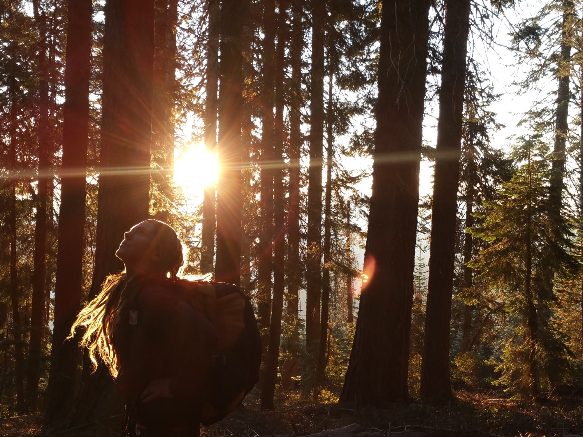 I was the first one on the trail today at 6:40 am. I felt very sleepy and sluggish for the first few hours of the day, but miraculously my eye felt so much better! I crept through brown downed trees and watched the sunrise peeking through the dense woods, sending a bright orange stream of glowing light right into my space. It was stunning and I had to stop and take some photos. These moments are pure magic. The photo I took below, is one of the very few self-portraits I have taken while out on the trail, and I love this one.