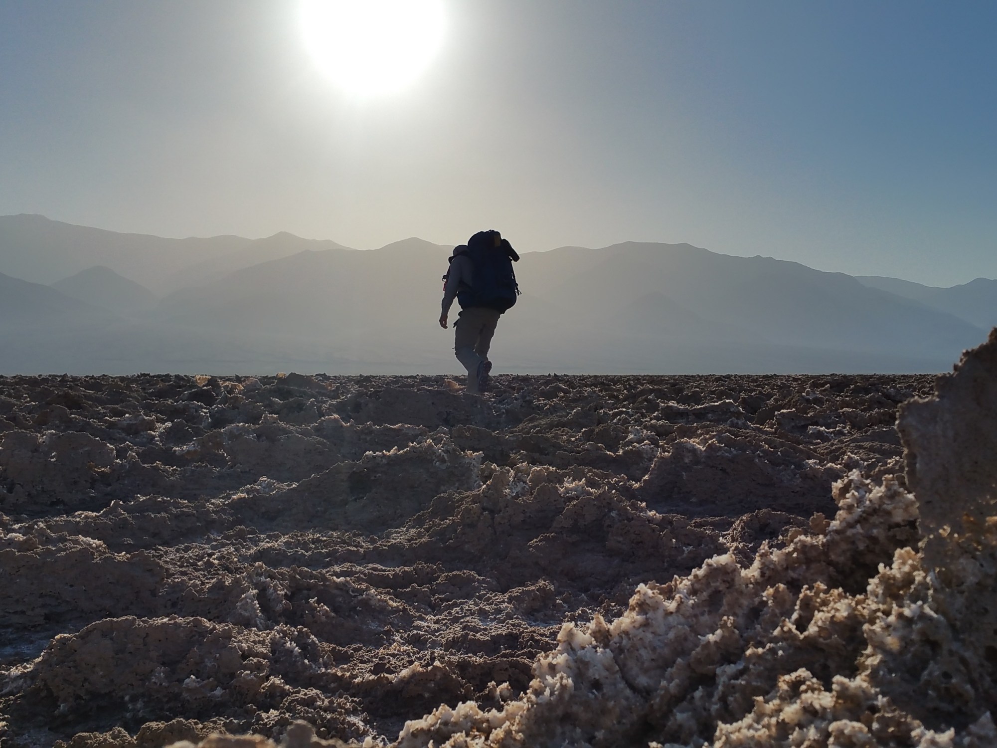 When we finally pulled up to the parking lot at Badwater, it was 4:34 pm and that very place I’d seen on computer screens and on Google Earth had made it’s way into three dimensions. I was there in real person, with all my senses, fully alive. I am doing this, I am going to walk to the top of Mount Whitney from here. Holy shit. Finally, we were finally starting out on this great adventure! The breeze picked up a bit and I noted how it felt even warmer here than at the Visitor’s Center, and was glad that it was only going to get cooler as the day wore on. I switched my InReach tracking on at 4:47 pm, after saying goodbye and thank you to the Austrians. We walked through throngs of tourists and day-hikers, and as is typical with most trail heads, within about a mile it was only us, walking out into the abyss of salt, sand and crusted mud.