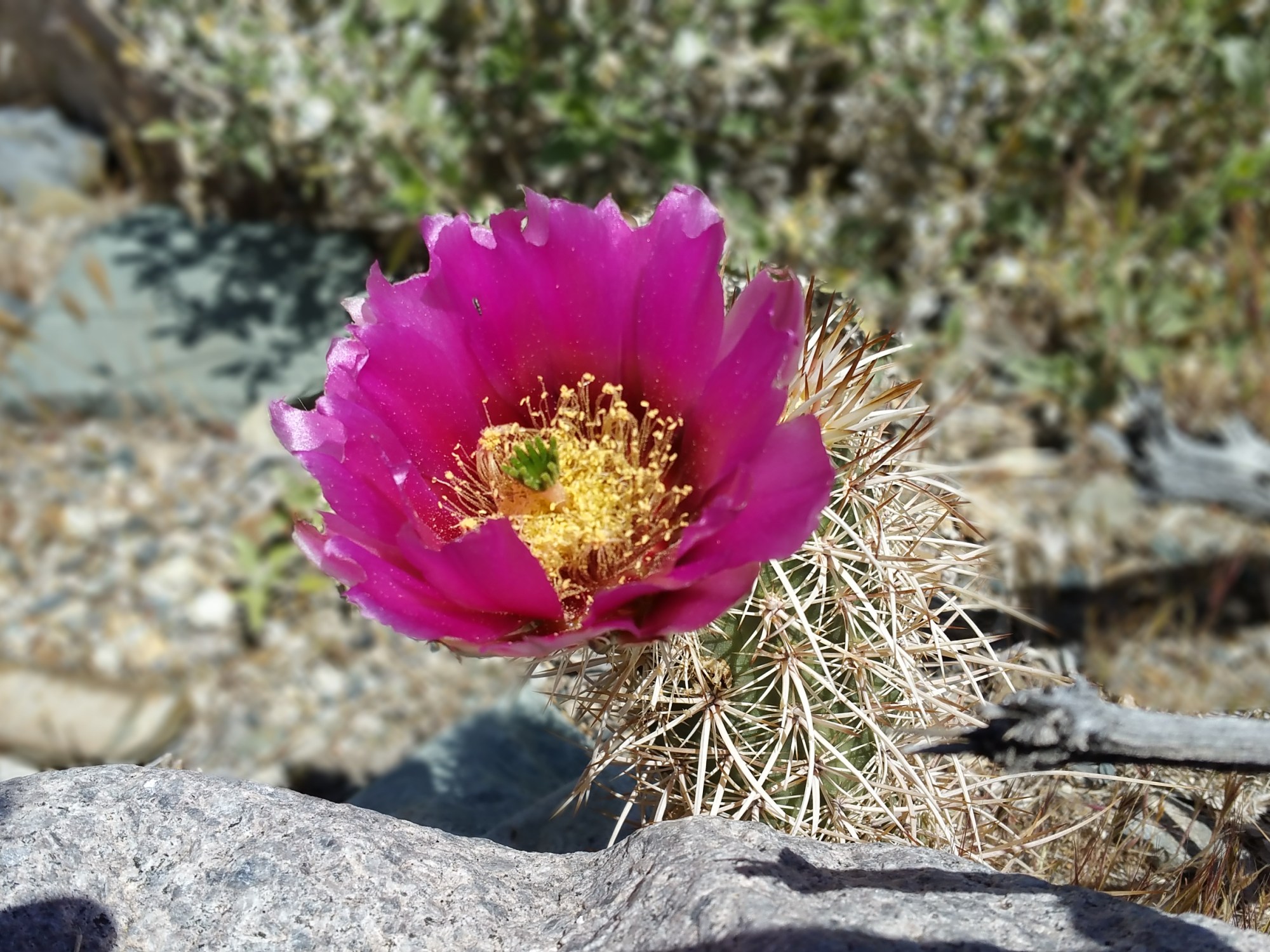 Walking in a wash is definitely not complicated when it comes to route-finding, but it is work getting through all the deep sand. There are side canyons and washes within them that come in from the side, and at a certain point I wondered which one we would find the clues to turn off to the Spring. I walked in the deep sand and over small boulders, dodged cacti and noted several lovely flowers, from cactus to lupine of all things! After walking for over an hour, I saw a narrow canyon off to the South and thought it might be the turn off for Hanaupah Spring, so I meandered in that direction, climbing out of the main wash I’d been walking in. Once I was up and out of the wash, it was much slower going, and I started to realize that when on the actual route, the idea is to take the path of least resistance. I was suddenly climbing over larger boulders and zig-zagging around even more prickly plants, so much so it had become quite inefficient. This can’t be right, I thought. I decided to check my GPS to get my location and I was, in fact, not on the route. The actual route stayed in that same big wash. I’d turned off too soon.