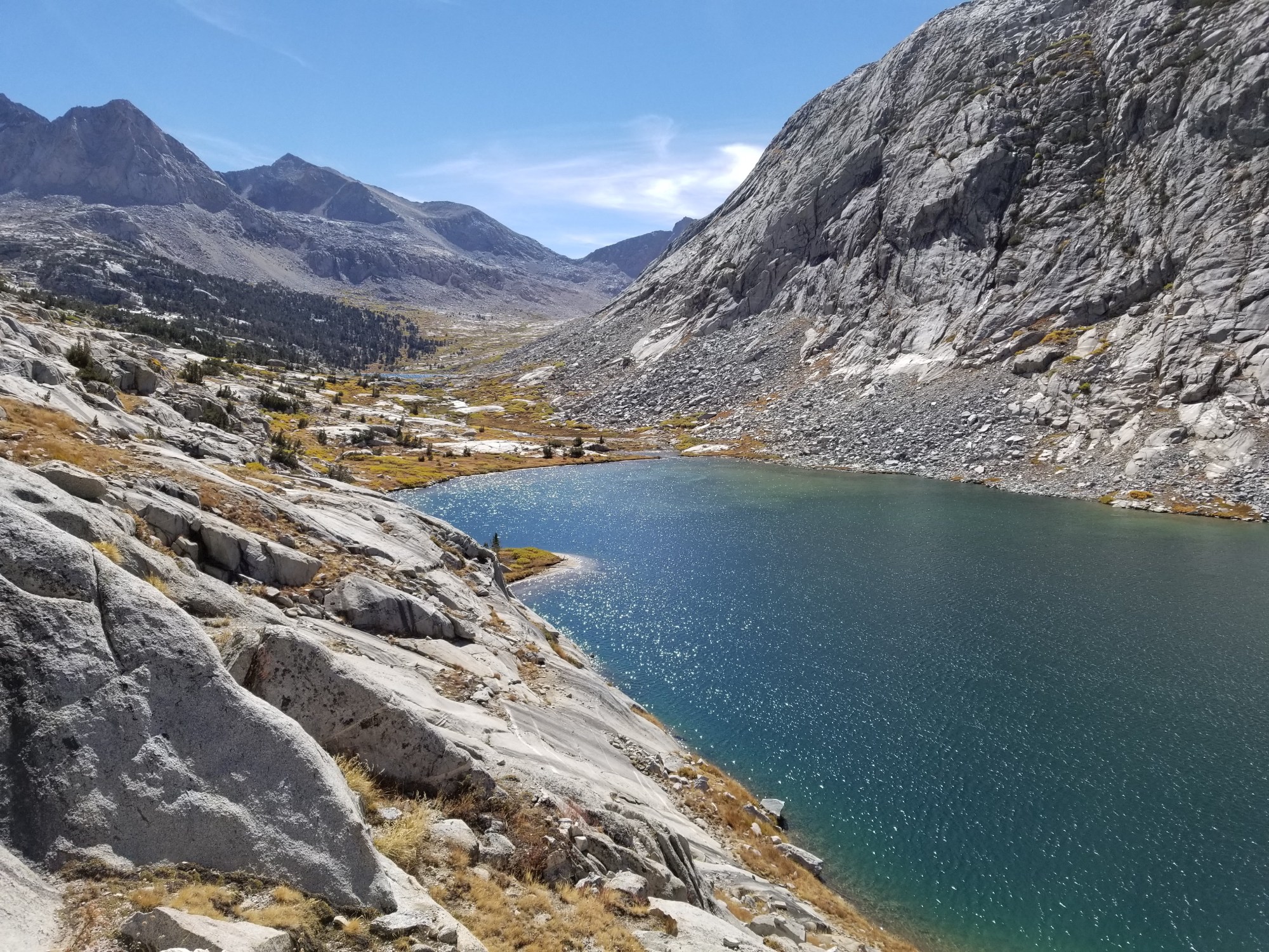 The SHR takes a sharp right off the trail at the Northern end of the Lower Palisade Lake, heading more East and Northeast. We broke off the trail and began ascending big slabs of granite interspersed with grassy ramps, and some class 2 scrambling. Cirque pass itself was not visible to us from where we were, and we learned it would elude us for quite some time. It was necessary to attempt this pass in stages, whereby you would climb up some boulders and grassy ramps to get to a bench where you found little lakes and lots of beautiful yellow grasses, little water outlets and the views back down into the Palisade basin were insane. Insane.
