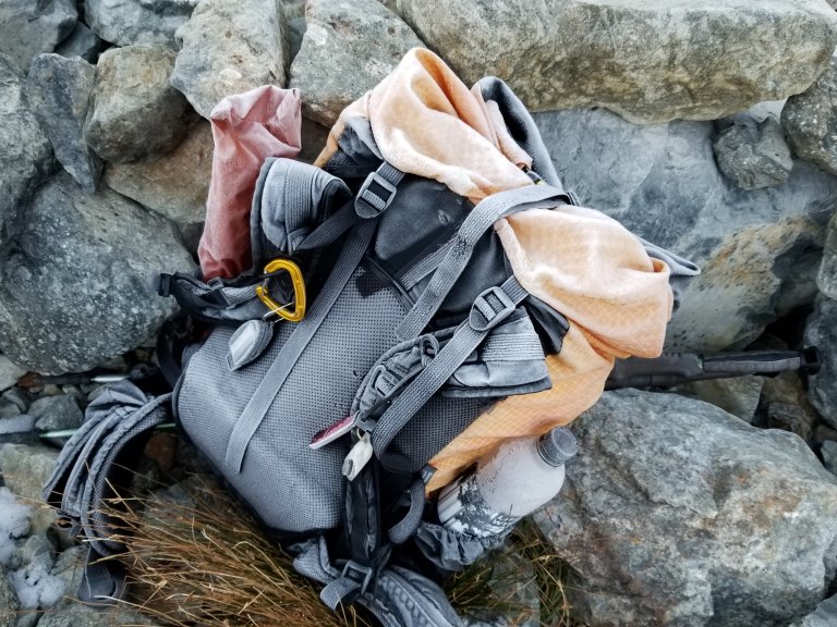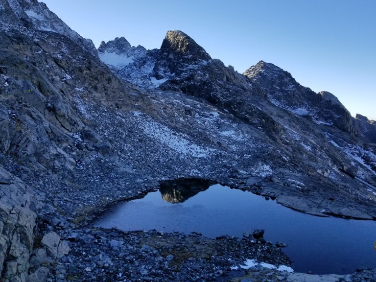So Hurlgoat suggested we just get going right away, since we weren’t going to see any sun for a while, and rather than sit there freezing over breakfast, we could get some talus hopping in and take a break in the sun later on. I was not super excited to skip coffee and breakfast, but willing to do it, since it really made the most sense. My pack was absolutely covered in frost, stupid me left it siting out all night, with nothing to protect it, what did I expect? I started changing into my day clothes inside my sleeping bag to keep warm, and choked down a couple of bars that were way too hard to be eaten.