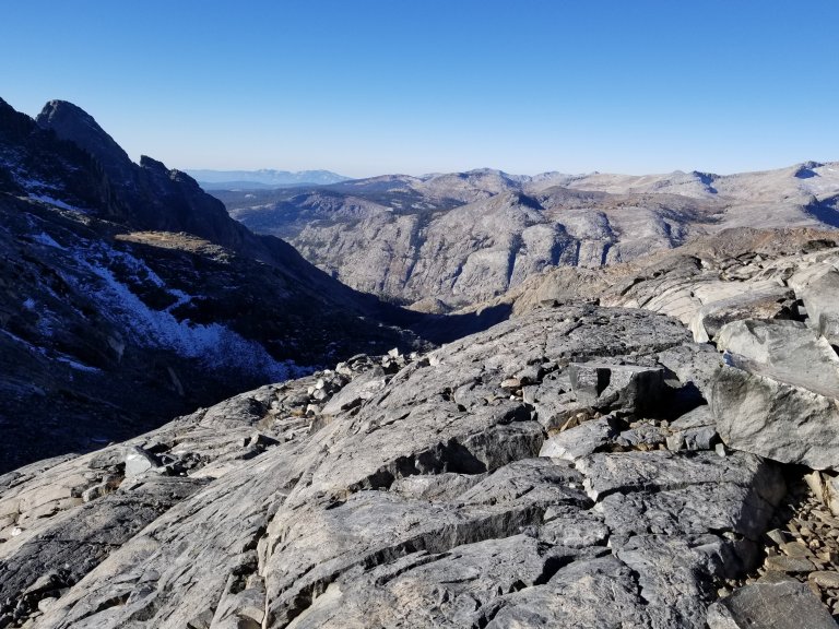 Speaking of slow, after lunch, we climbed some nice grassy ramps, and made our way up a slope that gave us even more tremendous views of the Minarets. They were dusted with snow and surrounded by puffy, swirling clouds. We took our time and stood there in awe. Where are we? It’s almost overwhelming, all the granite, all the space. How did we get here? It’s surreal and almost like an out-of-body experience. Then, wham! reality strikes back, we have more talus to negotiate.