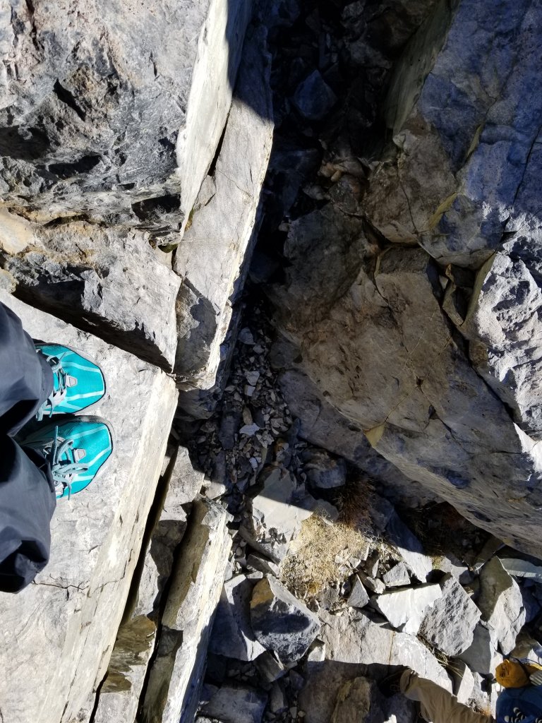 Looking over these cliffy ledges wasn’t all that bad really, it’s just very awkward lowering yourself down, with your pack on and trying to find a place to put your foot where you can’t see. It was a really long reach for me and I was glad he was there below me in case I slipped. There were enough other rocks nearby that I could use both hands and lower my body down slowly. Precarious, yes, but definitely do-able. So here we are again, what exactly is the definition of a class three? So, like Double Tap said, it was actually not terrible.