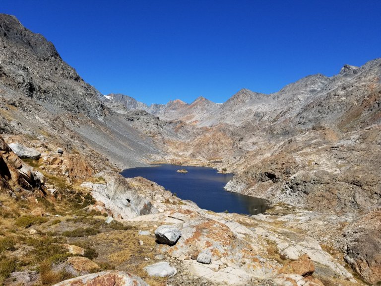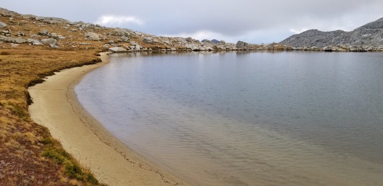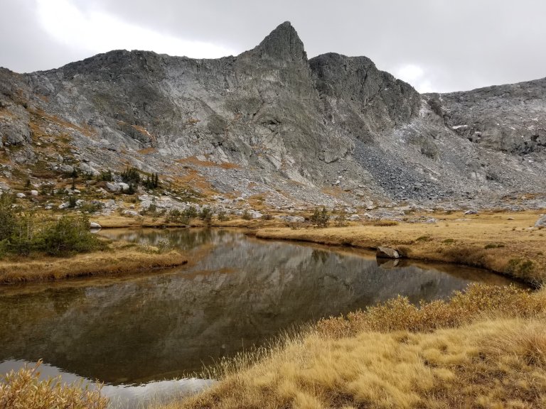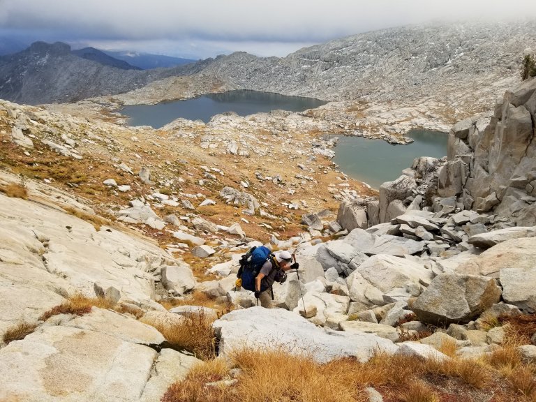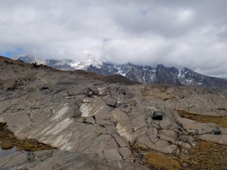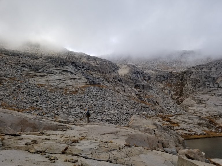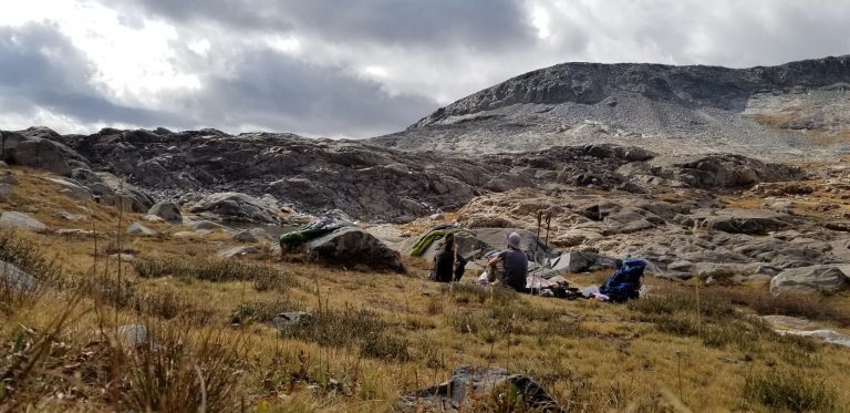 From Twin Island Lakes we skirted around the far side of the South Lake which was tremendously beautiful, and from there we climbed up and over a hump, then descended to a little meadow with a tarn. It was time for lunch! So happy to stop and take a break, and more than anything, I needed to dry out my gear. All of our stuff was soaked from the frost and condensation of the morning. We were very fortunate beacuse the sun was beaming down on us, as we watched billowy clouds build and begin to move in. The clouds were “looking darker than they should be” says Hurlgoat. I check my InReach weather to see what we are in for. “It looks like the coast is clear”, I report, and we feel relieved that we are not walking into another snow storm. We have lost some time on this week’s trek, first due to the snow storm, then due to lengthy snow covered talus fields that take forever and a day to get through. Our mileage had been pretty low, and I know part of that is me, I am just slow, well, slower than he is, but the weather was not exactly helping.