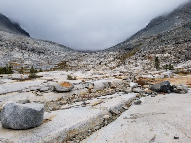 This valley is called Bench Canyon. It’s interesting, all this terminology. There are “gully’s” and “ramps” and “tarns” and “slabs” and “valleys” and “canyons” and “escarpments” to name a few. Apparently the long slope leading down into Bench Canyon was considered a “gully”. Could have fooled me. It looked like a big old slope to me. Anyway, I digress. We reached Bench Canyon and enjoyed strolling across flat, grassy land, with big smoothe granite slabs that had little cascades of water rolling down. The grassy meadow was interspersed with little creeklets that snaked the clearest water to and fro. We started from there, to climb up into a forest of Whitebark Pines, and some old lodgepoles with old souls. This ascent was quite pleasant and a nice grade, especially compared to a lot of the grades on this route, which are basically sraight up. This was a climb to be sure but it was lovely. I was grateful to be on “land” and the ability to simply walk and think and look and feel were welcome.