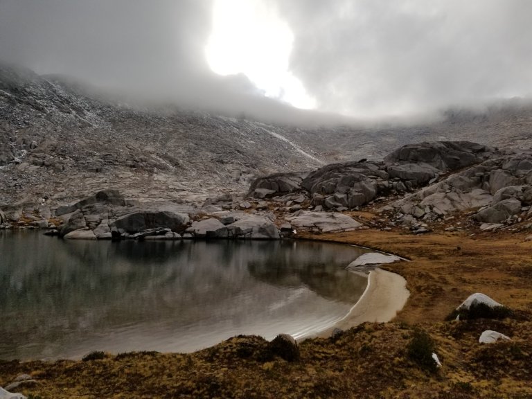 We made such an effort to keep our shoes from freezing last night, we slept with them inside our sleeping bags, and while they were still wet this morning, at least they were not frozen. The first thing we had to do once we set off was walk around this little tarn nearby where we camped. Hurlgoat takes the lead and skirts the absolute margins of the water, teetering on some rocks and stretching to make it around to higher ground. I am thinking it doesn’t look good. I bawk a little at his choice and while I could have found my own way around, it would have taken way longer and I didn’t want to make him wait already. So, I followed suit. I began following the same steps he had taken, only to discover that the length of step was just a tad too long for me, and while precariously balanced on a loose-ish rock, trying to figure out which step to take next, the rock dislodged and plunk went my left foot. It splashed and also got my right foot wet too. Dang it. I was so mad, I ended up walking straight through the water to get to the other ledge.
