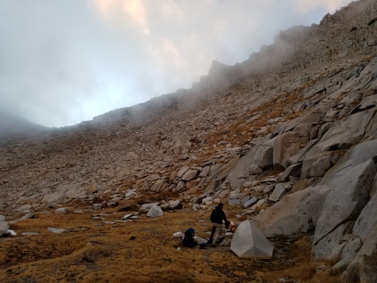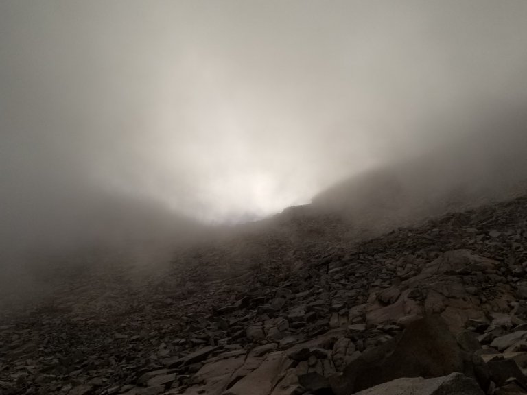 In fact, upon reaching this ledge, the first thing I thought, was “we could camp here”. We are very fortunate there is a tiny little pool of water, and that was enough to use a scoop with. Done and done. I made the suggestion to Hurlgoat and he was glad I did. We are choosing to adventure over the pass and down the talus in the morning. I hope the clouds will part and afford us tremendous views. Or at the very least, I hope we will be abe to actually see the pass because right now we can’t see shit.