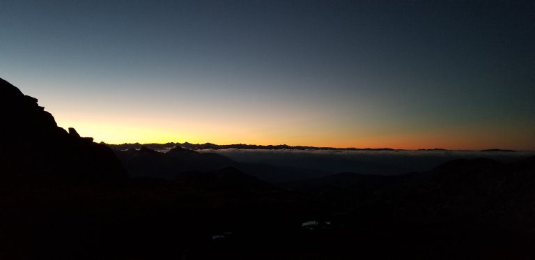 Well, he was right. We have another 50 miles. The thing is, not only are we running out of food and fuel, he has a plane ticket leaving in only three days. That’s impossible to catch unless we finish by tomorrow night. What to do? Well, my optimistic mind always likes to come up with a solution, so I offered several. But I could see that he was clearly in a state of distress brought on by lack of sleep and upset. He really wants to finish this journey to the end and right now it’s looking like that may not happen. We sat in silence looking over the ocean of clouds and witnessing a glorious sunrise. Then, we didn’t talk that much more about it. By 8:15 am we were climbing the last 200 feet up to Blue Lake Pass.