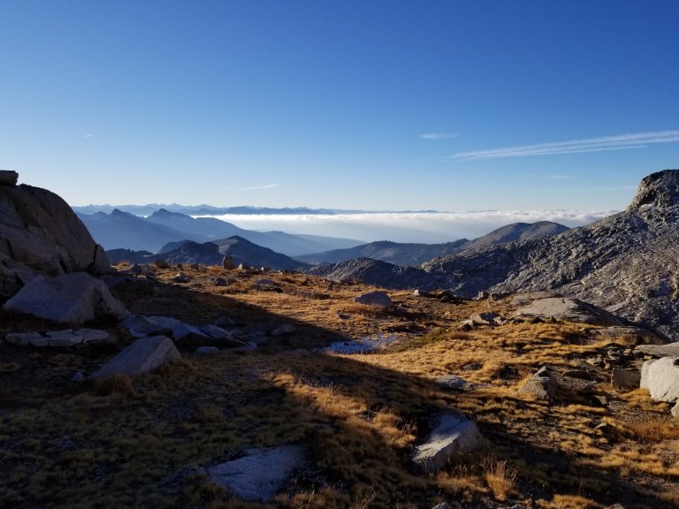 Suddenly, it was like being in Narnia, with yellow grasses glowing in the fields in the distance, big misty clouds floating around the heavens which were lined by the Clark Range of Yosemite. Once I no longer had to keep my haed glued to the ground, I got smacked in the face with this beauty! Crossing over the Pass, we crossed into the Boundary of Yosemite National Park. Looking at the views ahead, I started to feel hopeful that everything was about to get better.