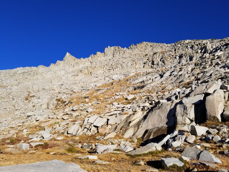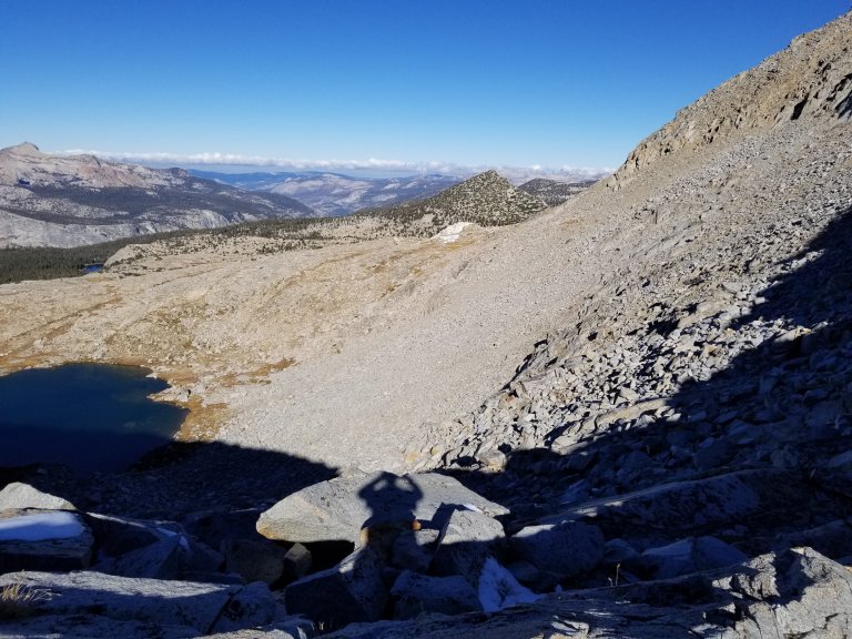 Once we got on track to make it down the other side of the pass, it was simply scrambling over talus. Lots and lots of talus. Slow going. And this morning I just didnt trust the rocks. They seemed menacing, my body felt weak, not confident. Since we were in the shadows, it was quite cold. Touching all the rocks was like touching ice, my hands were getting so cold. It was hard to tell where there was ice and what might be slick again. So tension and anxiety mounted in me. “I hate this” I keep thinking. “This is just not for me.” I started having thoughts of getting off trail at Tuolomne Meadows, and letting Hurlgoat continue on his own. I have all these mixed feelings while I am out here. I love so much of it, and then I absolutely hate parts of it. Is this normal?