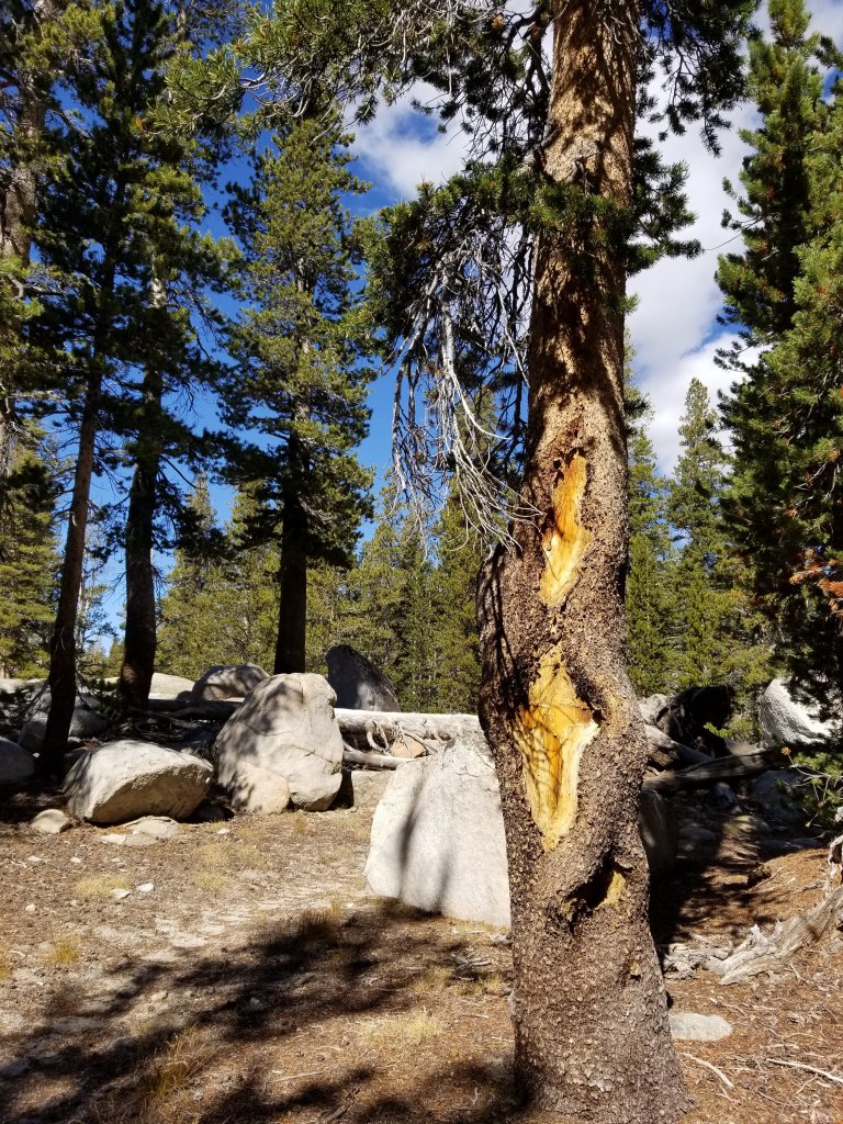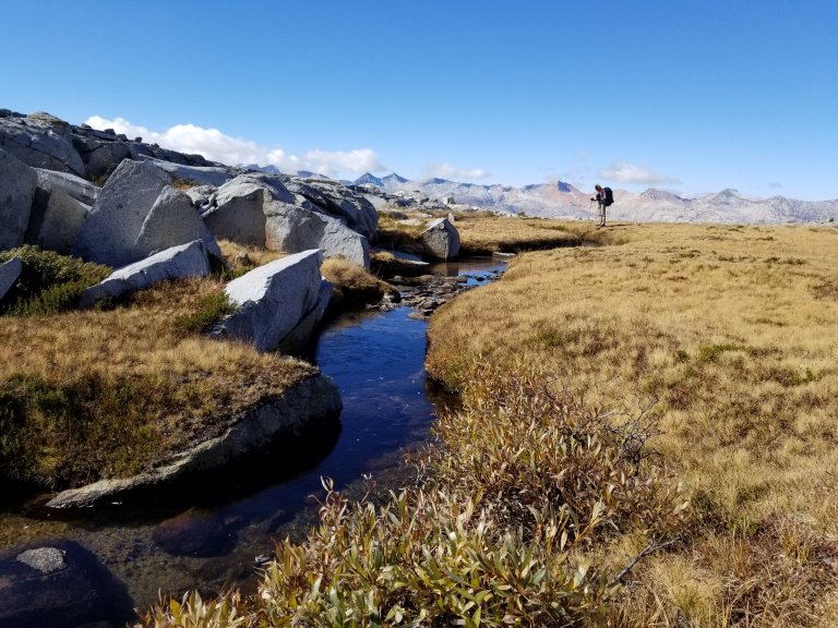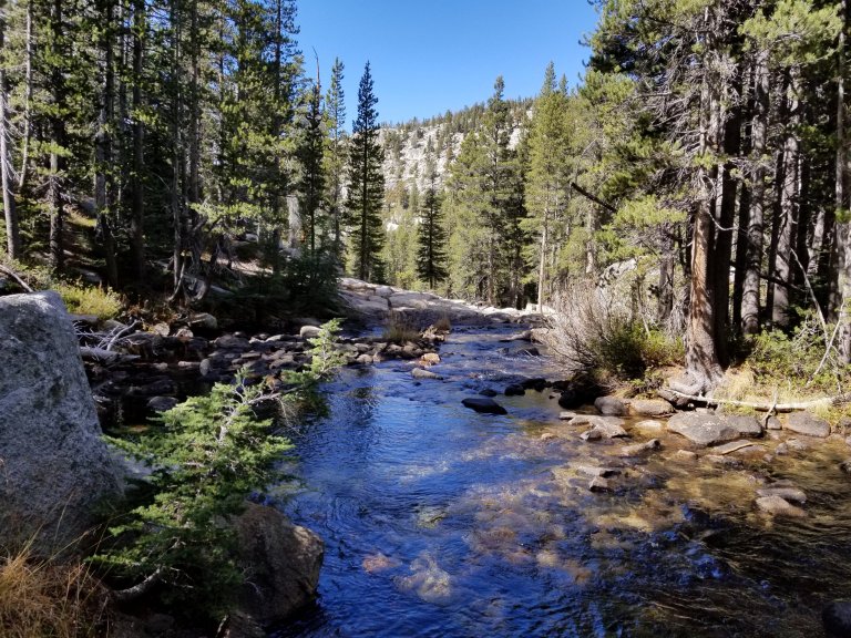 We looked over the Nat Geo map we broght along and confirmed our route. Then, Hurlgoat hung back a bit so he could listen to music while he walked and I went on ahead, almost racing. We reached the Lyell Creek fork within about 2 miles and rock hopped across. We found a lovely smooth white granite rock on which to sit and have lunch. Once again, laying all our gear out on display to dry out in the sun. Today was a sunny day, but not without clouds and not without a biting cold breeze from time to time. When the sun was obscured by the clouds and then the breeze picked up, it went from t-shirt weather to down puffy weather instantaneously. It was easily a 20 degree drop. Then the sun would come back out and roast us.