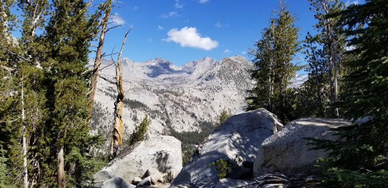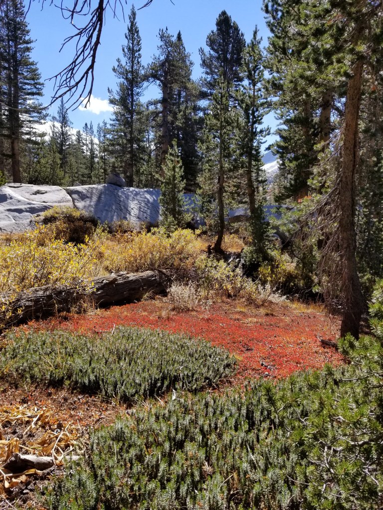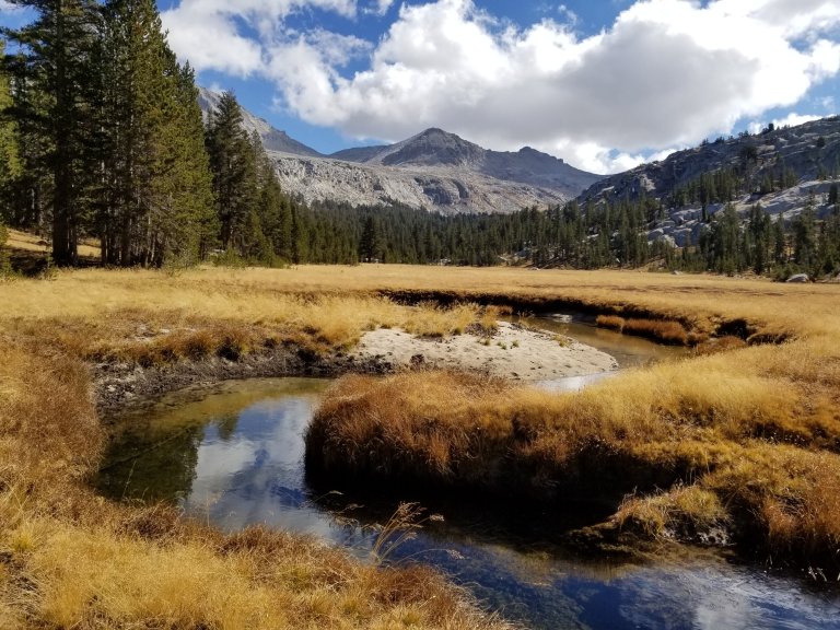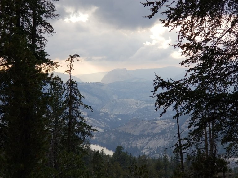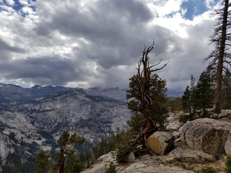 Similar to yesterday, while we sat eating lunch, we watched clouds build and some of them got quite dark too. By the time we set off for the afternoon, we were feeling a little chilled. I dressed in layers that were adjustable, and had my gloves handy. The trail from Lyell Creek climbs up a ridge that ends up paralleling the Merced River from several hundred feet above. I was super excited about this because down below (not that I could see this) there was Washburn Lake. I camped at that lake back in October 2012, it was my first “solo”‘ backpacking trip. Ah, the nostalgia! Hurlgoat had spent time in Yosemite back in 2014 as well, and we both got excited sharing stories from each of our previous adventures.