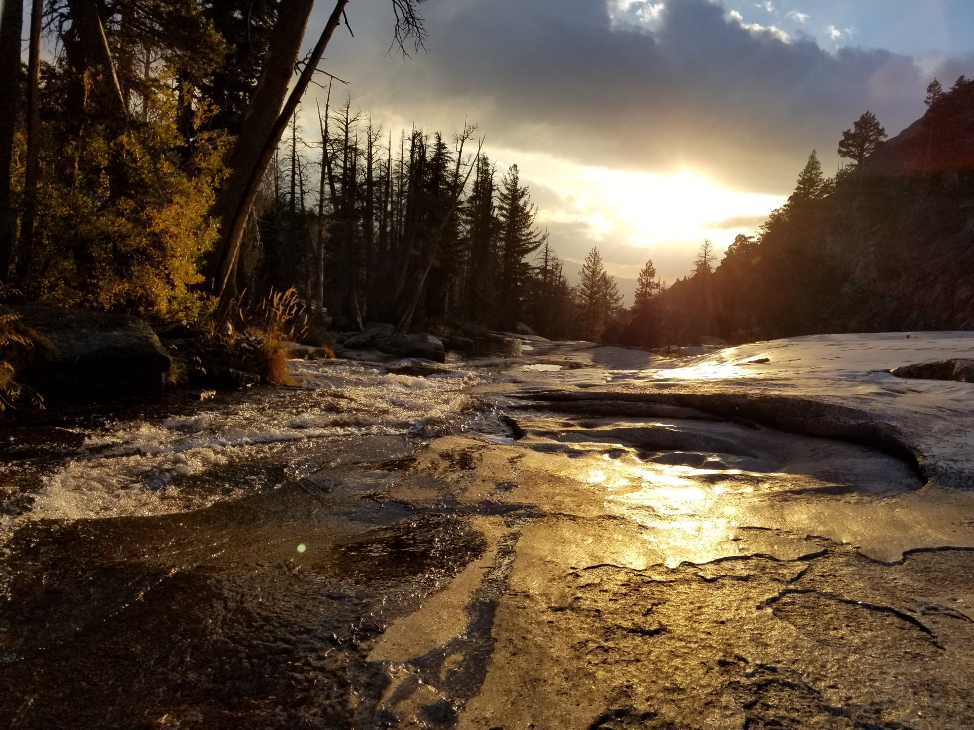 We enjoyed the sublime hiking all afternoon and into the golden hour at dusk, watching the light pour through a break in the clouds just in time for us to catch a glimpse of Half Dome through the trees. We reached Lewis Creek and now followed the Lewis Creek Trail up a steady climb, paralleling the water.