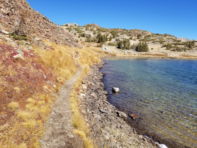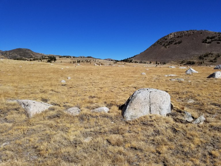 The trail climbed through lodgepole forest and I pushed to make a 2 mph pace. After about 800 feet or so of climbing, the terrain flattened out and opened up into a meadow dotted with large granite boulders sunken half way into the earth, and then Lower Gaylor Lake. The wind picked up across the meadow and while I was happy to be walking on flat ground, I was chilled. I tried to be tough and get through it, but wound up just stopping to put my jacket back on. It’s just going to be one of those days, I kept thinking.