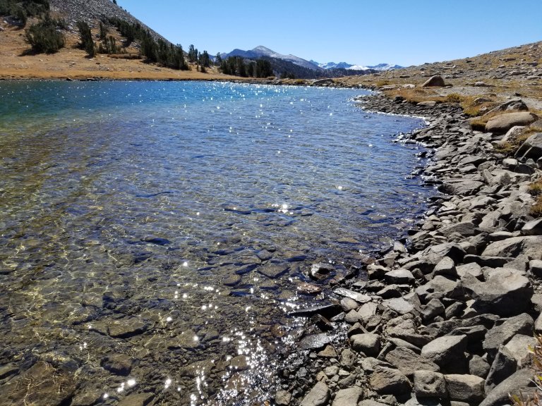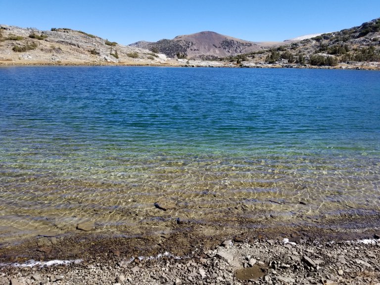 After Lower Gaylor Lake the SHR splits off for about a mile of cross country travel towards Middle Gaylor Lake. We could see on the far side of Middle Gaylor there were a few other people out there, fishing. We didn’t get too close to Middle Gaylor though, instead we hooked on to another light trail which follows the inlet to Middle Gaylor, then up to the Upper Gaylor Lake shortly thereafter. The High Route takes you right next to the Upper Lake, which at the shores has blackened exposed rocks which lead to some of the clearest and prettiest water I’ve ever seen. This water was like the Caribbean and there were various shades of turquoise and cobalt swirling around as the sand and rock bottom curved underneath. I want to drink this liquid turquoise. The sunlight did it’s glittery thing on the surface of the water and in the distance were snow covered peaks. It was definitely an idyllic setting to stop and take a lunch break. So that’s what we did.