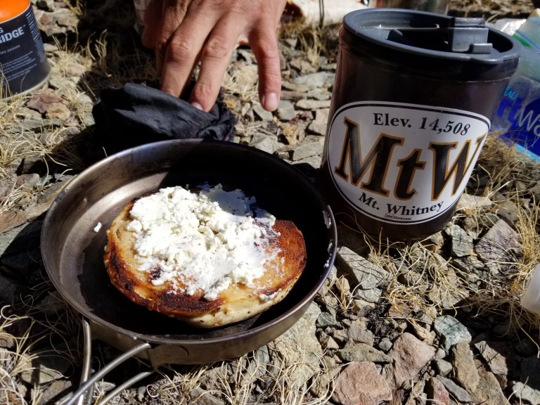 It proved to be difficult to find a spot out of the wind, or even protected from the harshly cold breeze, but we did manage to find a comfortable spot in a grassy area that was in full sun and a little less breezy. I’m excited about my food this week, since I resupplied unexpectedly in Yosemite Valley, I opted to shop for a different variety of meals and snacks, rather than the same ones I’ve been eating all Summer. So, for lunch today I had an everything bagel which I toasted with plenty of butter and then smothered with Boursain herbed goat cheese, Yum. I also strayed from my tried and true BBQ Kettle cooked potato chips and found a really good bag of Tortilla chips, restaurant style. They are medium thick, salty and oily and have a great crunch, just how I like them.