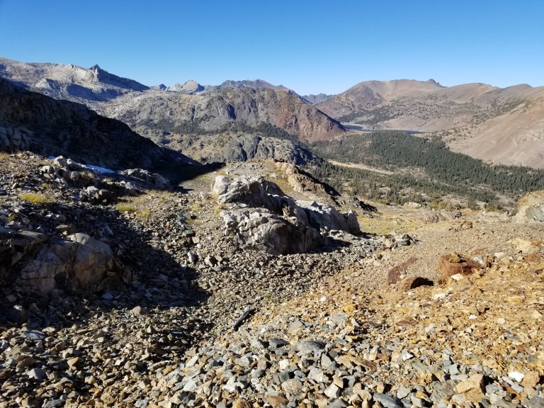 Climbing the pass was not a whole lot further, maybe another 250 feet of elevation gain, and was one of the easiest passes of the entire route. I mean, there have been “saddles” we’ve climbed through that were more intense than this one. The pass flattened out on top into a little grassy knoll, there was yet another mine dug out and tons of loose rock piled in a mound. Looking to the North from the pass, we could see that the route heading down to the lakes below would take a little more effort and time. There were several grassy and rocky ramps though, and several little cliffs as well. The whole area was quite rocky and we definitely relied on our GPS track to lead us safely down. We ended up backtracking a few times simply because we were too high or too low to make it to the next level down. It was slower going but nothing as bad as loads of talus!