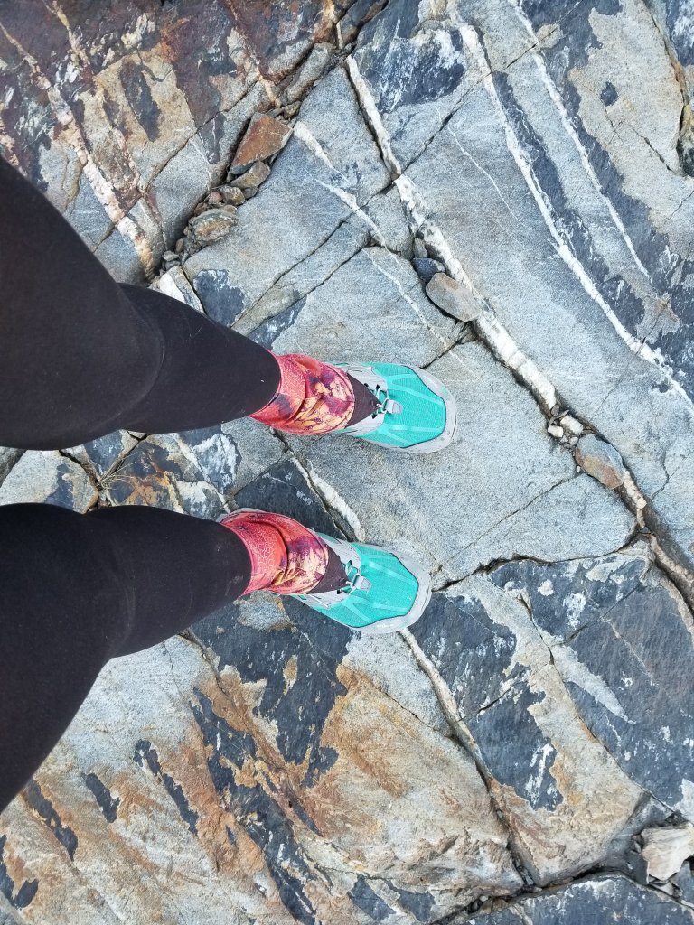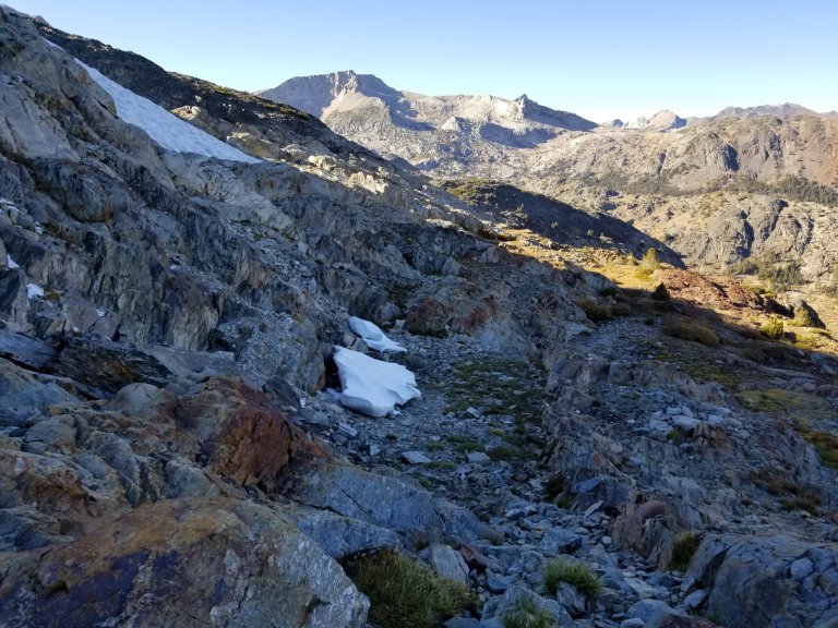 The rocks now are definitely different. We are and will be traversing the Sierra Crest from now on, until the end of this hike. From the description in Roper’s book, we are also on the transition line where the granitic rock and metamorphic rock intersect, so what we are walking on this afternoon is totally different rock. As I balanced and concentrated on my foot placement, I thought about this, how I have to get to know this rock. This rock is strange to me and I don’t know how it will behave. I don’t know how much grip I will get from it and I don’t know how loose it is.