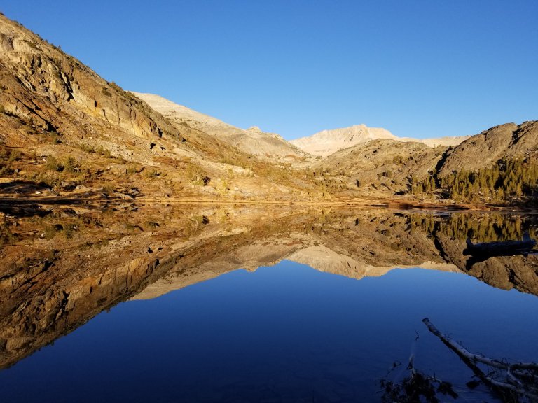 We did really good and got on trail by 7:05 am this morning just as the sunlight was hitting and warming up the East facing walls of Conness Peak. The ridge of the peak juts out to the East quite far, and we would be climbing this today. The sun strikes the entire wall in the morning and it glows so beautifully. A perfectly still reflection of land on water on sky made me begin this day with a still, peaceful mind.
