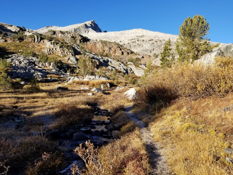 I was totally bundled up in my down puffy for the first couple miles, but we did start climbing right away and soon we were in the sun, following a lovely trail alongside a cascade and we even ran into some day hikers. It was really funny because the man actually recognized Hurlgoat from Youtube! We chatted with them for a few minutes, they were out to climb Conness Peak.