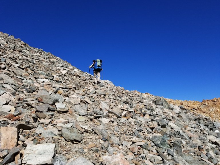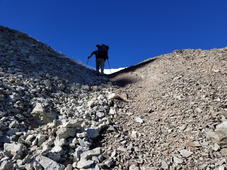 Setting off for the pass, we first aimed for the white talus, then red talus and finally made a hard left and up the gray slate scree slope we climbed. That was the first 300 ft and we actually accomplished this fairly easily.