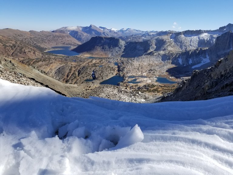 We basically made our way straight up the middle, or slightly to the left, aiming for a snow patch, right at the top of the pass. As we climbed the views of the lake basin below became more and more stunning. So Stunning, in fact. These are the moments you just absorb like a sponge, take as many photos as you can, but since you have to keep moving, they are so fleeting. Everything goes by in a blur. If only I could freeze these moments in time….